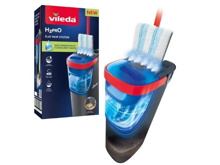 Vileda H2PRO Flat Mop System H2PRO rengøringssæt revolutionerer gulvrengøring med et innovativt sekundært ankesystem i spanden, der sikrer en 100% adskillelse af frisk og spildevand. Sættet indeholder ud over spanden en fladskraber med 4-delt skaft (132 cm) og et eksklusiv mikrofiberbetræk. H2PRO fladvinduesviskere muliggør en hygiejnisk rengøring, hvor der kun anvendes rent vand. Den aftagelige 1,2 liter vådvandstank er ikke kun vandbesparende, da den forbruger op til 75 % mindre vand, men rengør også effektivt op til 60 m² areal. Efter rengøringen kan den kompakte spand (23,5 x 41 cm) opbevares pladsbesparende.