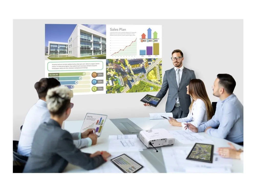 EB-W53 er designet for å være enkel i bruk, og har flere projektorfunksjoner som tavlemodus, presentasjonsmodus og kinomodus for ulike miljøer. Manuell fokus og 2x digital zoom gir tilpassbare justeringer for å oppnå den perfekte skjermstørrelsen, fra 83,8 cm til 952 cm. I tillegg sørger innebygde sikkerhetsfunksjoner som passordbeskyttelse og et Kensington-sikkerhetsspor for at enheten er trygg og egnet for ledelsesmiljøer.