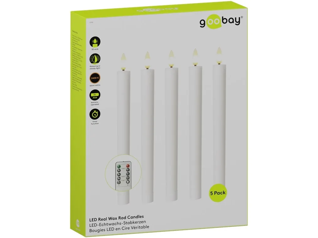Mål pr. lys (Ø x H): 2,0 x 25,0 cm, hver LED-stearinlys drives med 2x AAA-batterier (ikke inkluderet), fjernbetjening: 1x CR2025 (inkluderet)