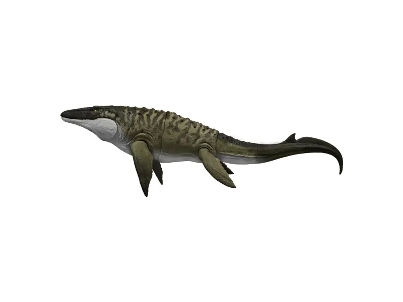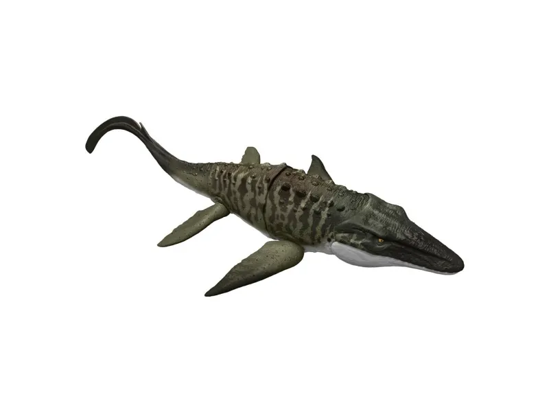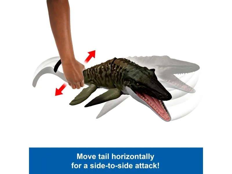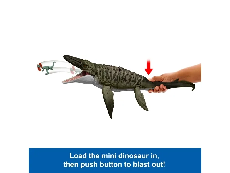 This Bite 'N Blast Mosasaurus dinosaur action figure with its distinctive aquatic design brings the excitement of Jurassic World Rebirth home. A button-activated 'Bite' feature allows dramatic re-enactment of movie scenes and inspires creative play. Kids can control the attack by holding the tail and pressing the button to make the jaw open wide to bite the mini Dilophosaurus figure that's included can be completely 'swallowed' into the large Mosasaurus body! Press the button again to 'Blast' the prey back out! With movable joints and movie-accurate design on the 25.7-inch long Mosasaurus, it's ready for both play and display. Scan the Tracking Code under the fin in the free Jurassic World Play App with a compatible smart device (Android or iOS, not included) to unlock a digital version of the dinosaur and play the fiercely fun game to race various vehicles on land, air and sea. Makes a great gift for dinosaur fans ages 4 years and up. Colours and decorations may vary.Jurassic World Rebirth Bite N Blast Mosasaurus Action Figure and Mini Dilophosaurus, Dinosaur Toy. Recommended age (min): 4 yr(s), Product colour: Green, Grey, Material: Plastic