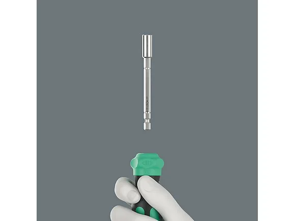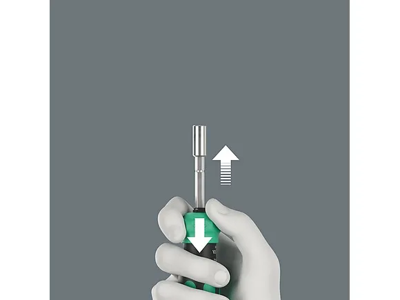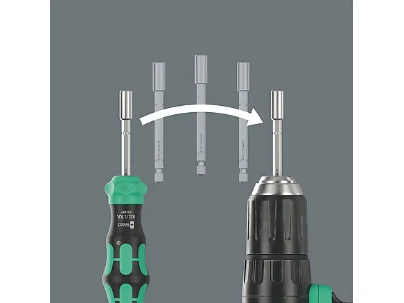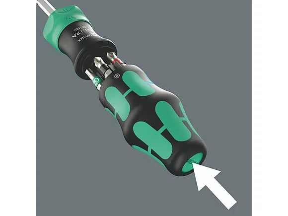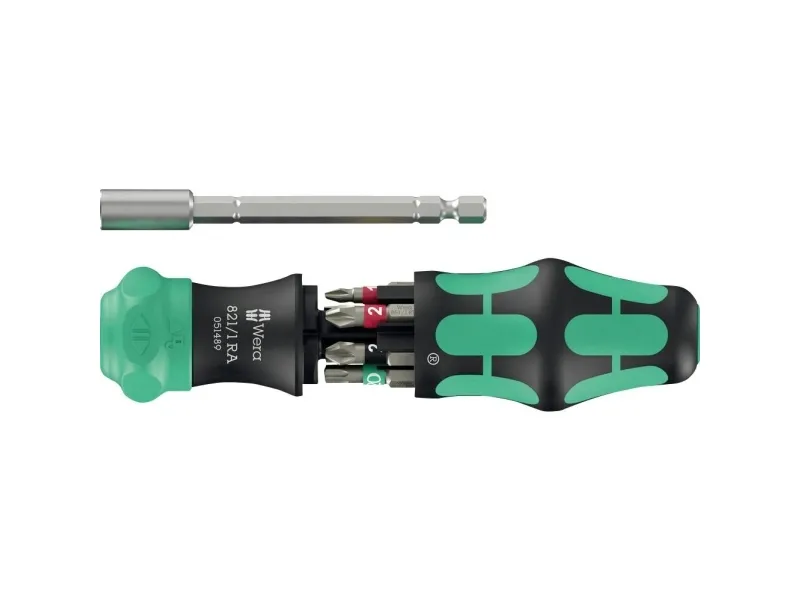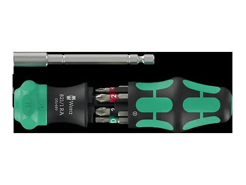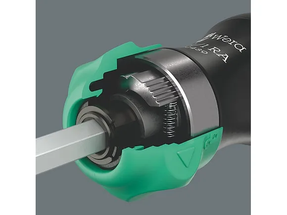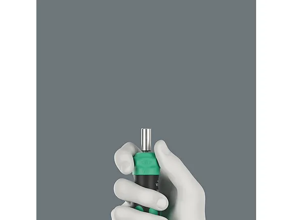 Kraftform kompakt 28 RA 1, 6-dele Kraftform-håndholder til 1/4 bits. Skraldenøglen med finfortanding, som er integreret i håndtaget, sørger for hurtigt arbejde. Omskiftningen af skrueretningen er intuitiv: Hvis ringkontakten drejes til højre, skrues mod højre, drejes ringkontakten til venstre, skrues der mod venstre. Til præcist arbejde kan skraldemekanikken deaktiveres med 0-positionen. Inklusive 6 BiTorsion-bits til lang levetid, tandhård, til universel brug; placeret i det greb-integrerede bit-magasin. Den stærke permanentmagnet i 1/4 bitholder sørger for, at bits sidder sikkert fast. Den 2-komponents Kraftform-greb med sin kombination af hårde og bløde zoner muliggør fast indpakning og præcist arbejde. Anvendelse: Egnet til bits med 1/4 -udvendig sekskant iht. din ISO 1173-C 6,3 og Wera tilslutningsserie 1 udførelse: Skralde med finfortanding, intuitivt skift, til præcist arbejde kan skraldemekanikken deaktiveres med 0-position; 1/4 indvendig sekskantholder, magnetisk; rustfri stålhylster, kraftig permanent magnet. 6 BiTorsion-bits til lang levetid, tandhård, til universel anvendelse. Take it easy værktøjsfinder: Med drev-farvemærkning og størrelsesstempel, så man nemt finder den ønskede bit. Håndtag: Kraftform med anti-skrid, flerkomponent, med integreret magasin
