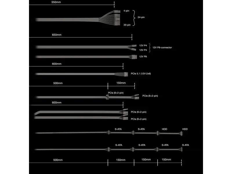 AC-strømkabel Strøm 24-stifts ATX med avtakbar 4-stifts modulær kabel 55 cm Strøm 8-stifts +12 V med avtakbar 4-stifts seksjon modulær kabel 65 cm Modulkabel for 8-pins EPS12V strøm 65 cm 16-pinners 12VHPWR modulær strømkabel 60 cm 2x 8-stifts PCI Express-strøm med avtakbar 2-stifts delmodulkabel 65 cm 2 x 8-pins PCI Express-strøm med avtakbar 2-pins delmodulkabel 60 cm 15 pins seriell ATA modulær strømkabel 95 cm 15-pinners SATA strømkabel / 4-pinners intern strømkabel modular kabel 95 cm
