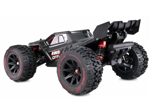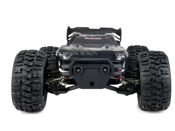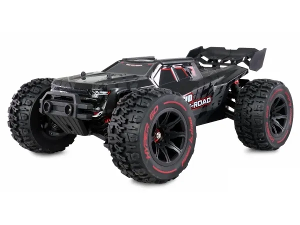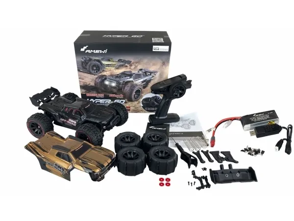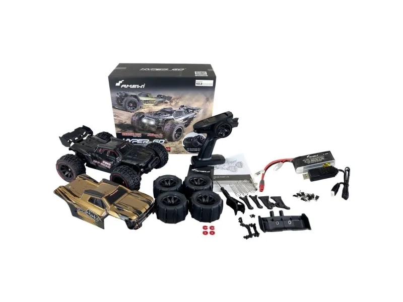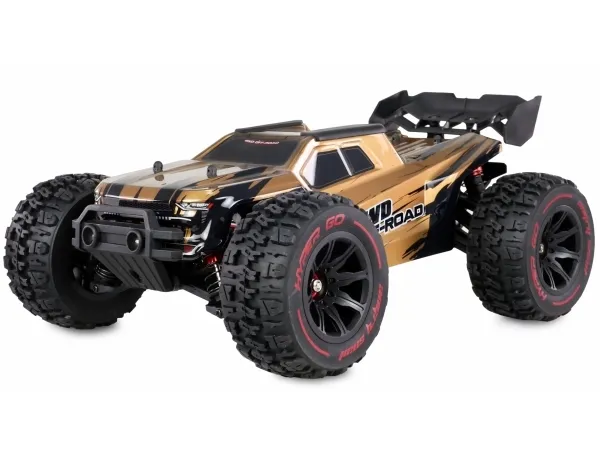 Hyper GO Truggy brushless 4WD 1:14 RTR sort inkl. Wheelie-Bar, reservedele, + guldfarvet karosseri + 2. Sæt hjul Lang levetid: Alle drevkomponenter (gear og differentiale) er fremstillet i metal Stabil kørsel: Takket være aluminium-chassisplade Metal CVD-drivaksler: Til direkte drev til hjulene 2S LiPo Power med 7,4 V, 25 C og 3000 mAh Professionel Brushless Racing motor til høje hastigheder på op til 55 km/t. Hurtig servostyring for livlig retningsskifte på alle underlag Olietrykstøddæmpere i aluminium Kardanaksel af metal Meget stabile karosserier i sort og guldfarver med Skid-Plates på taget Karosseriklemmer med gummilasker til nem fjernelse Aktiv blæser på motor og regulator for optimal køling Led-belysning foran i kofangeren Metal-tværledsholdere Med Wheelie-Bar for bedre kørekontrol Ekstra reservedele medfølger Hyper Go Brushless Truggy i målestoksforholdet 1:14 kommer takket være sit brachiale 4WD-drev på over 55 km/h top-speed. Komponenter af høj kvalitet som aluminium-olietryk-støddæmpere, metal-CVD-drivaksler, -kardanaksler, -gear og -differentiale sørger for en lang levetid for denne offroad-racers. En aktiv blæser på motoren giver optimal køling. Det indstillelige landingsstel, der sidder på en aluminium-chassisplade, sørger for ekstremt høj sporsikkerhed. En Wheelie-bar til mere kørestabilitet fuldender pakken. Al elektronik er beskyttet mod vandsprøjt og muliggør uindskrænket anvendelse i outdooranvendelse. De stort dimensionerede high-grip-dæk af blødt gummi sørger ved fuld gas for stabilitet på stort set alle underlag. Specielt beregnet til sand er Hyper Go Truggy vedlagt ekstra sandepadhjul. Således er det sjovt at køre med for eksempel stranden eller i en grusgrav. Den praktiske 3-kanals fjernstyring overfører ikke kun alle funktioner uden interferens, men via en ekstra knap kan man tænde og slukke forlygterne. 2,4 GHz systemet kan desuden køre flere modeller parallelt. Hvis det ikke skal være så hurtigt, har senderen en kontakt, der reducerer den maksimale hastighed til 70 procent. RTR-pakken er udstyret med alle nødvendige komponenter - undtagen på almindelige batterier i husholdningen til fjernstyringen. Til førere, der gerne vil have lidt afveksling ved optikken, er der endda vedlagt et ekstra guldfarvet karosseri. Derudover medfølger der udover ekstratilbehør som Wheelie og hårdere dæmperfjedre også en masse reservedele som forreste bærearm, karosseriholder og reserve-hækvinge.