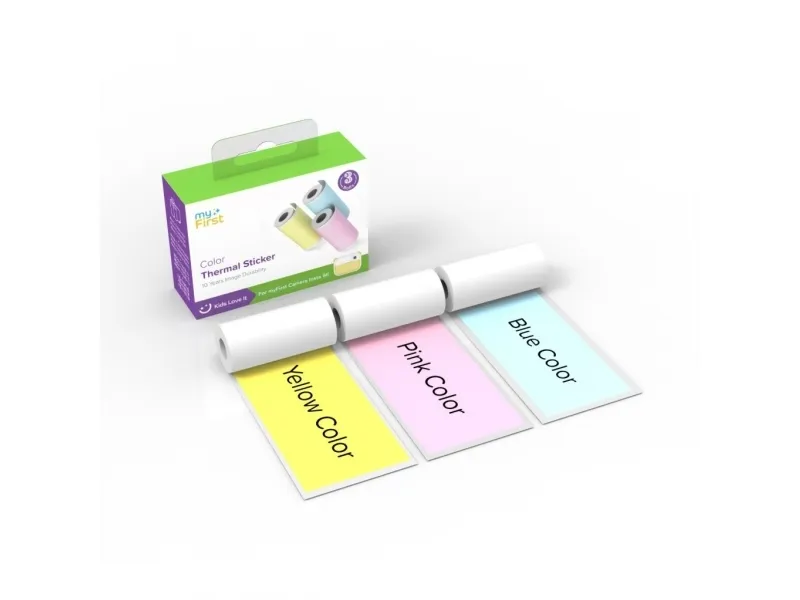 Spark creativity and instant fun for kids with a playful thermal sticker camera experience. Designed for the myFirst Camera Insta series this colorful set helps children print sharp long-lasting sticker photos on smooth vibrant thermal paper that is easy to handle and perfect for arts crafts and scrapbooks. Compatible with myFirst Camera Insta 2 Insta Wi and Insta 20 Sharp and dark image density for clear prints 10 years image durability for keepsake memories Smooth paper surface for clean jam-free printing Colorful thermal sticker rolls included in pink blue and yellow Compatible with myFirst Camera Insta 2 Insta Wi and Insta 20 No guesswork or adapters needed. This thermal sticker solution is purpose-built for the myFirst Camera Insta family ensuring a perfect fit and reliable printing performance. Kids can load rolls quickly and start printing right away whether they are at home in class or on the go. Sharp and dark image density for clear prints Every print pops with crisp outlines and high contrast so drawings doodles selfies and snapshots look bold and easy to see. The enhanced density helps photos and stickers stand out on notebooks water bottles and craft projects. 10 years image durability for keepsake memories Prints are made to last. With up to 10 years of image durability your child?s creations and keepsakes can be saved displayed and revisited over time without quickly fading. Smooth paper surface for clean jam-free printing A refined smooth paper surface feeds evenly through the printer to help reduce smudges gaps and paper jams. Kids get consistent satisfying results with less mess and more creativity. Colorful thermal sticker rolls included in pink blue and yellow Add personality to every print with vibrant color sticker rolls. The fun trio of pink blue and yellow inspires imaginative themes and makes it easy to organize or decorate projects with a burst of color. Package includes 1 roll yellow thermal sticker paper 3 m 1 roll pink thermal sticker paper 3 m 1 roll blue thermal sticker paper 3 m Product specifications Roll width: 57 mm Roll diameter: 26 mm Roll length: 3 m per roll Image durability: up to 10 years Paper surface: smooth finish Compatibility: myFirst Camera Insta 2 Insta Wi Insta 20 Roll type: free end roll (easy start)