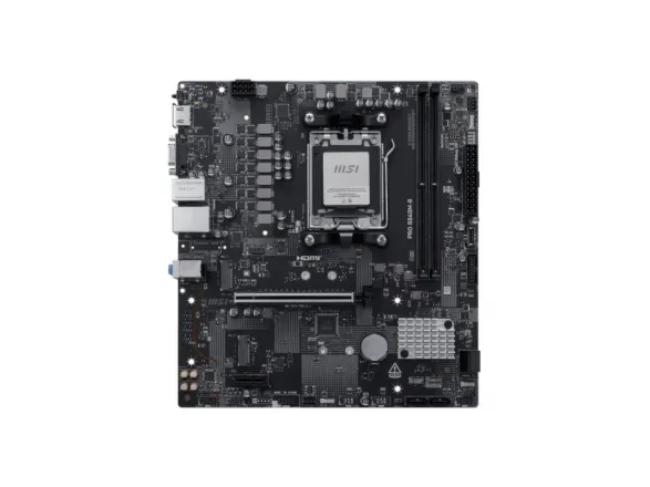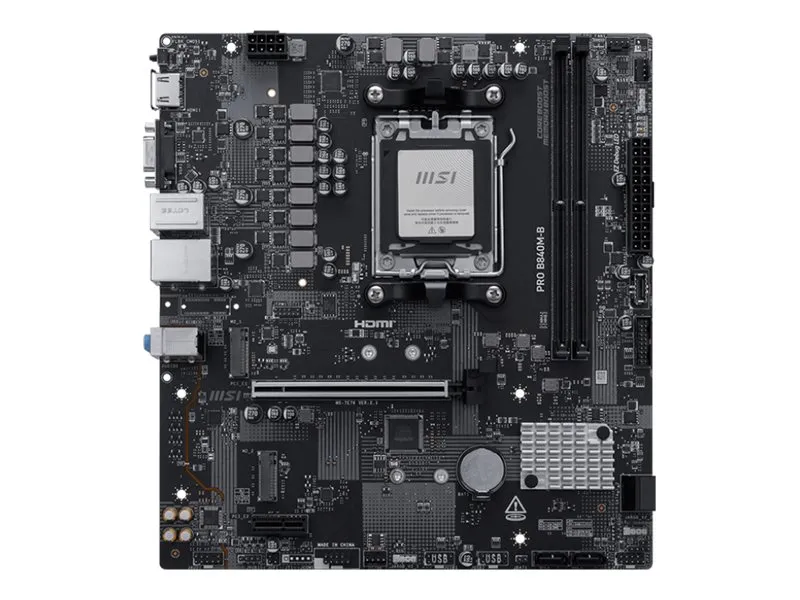 The MSI PRO B840M-B is designed to meet the demands of performance-driven users, featuring a robust AMD B840 chipset and compatibility with Ryzen processors from the 7000 to 9000 series. This micro ATX motherboard supports DDR5 SDRAM with speeds ranging from 4800 MT/s to 8000 MT/s when overclocked, ensuring users can maximize their system's memory capabilities. The motherboard includes dual-channel memory architecture and a well-structured layout, allowing for efficient multitasking and responsiveness during various computing tasks. With a variety of connectivity options, the PRO B840M-B offers multiple USB ports, including USB 2.0 and USB 3.2 Gen 1, as well as audio options powered by the Realtek ALC897 codec, providing high definition audio output. The integrated 2.5 Gigabit Ethernet ensures rapid networking capabilities, enhancing online activities and gaming experiences. Other notable features include ESD protection, MSI Audio Boost, and MSI Mystic Light for customizable aesthetics, making this motherboard functional and visually appealing.