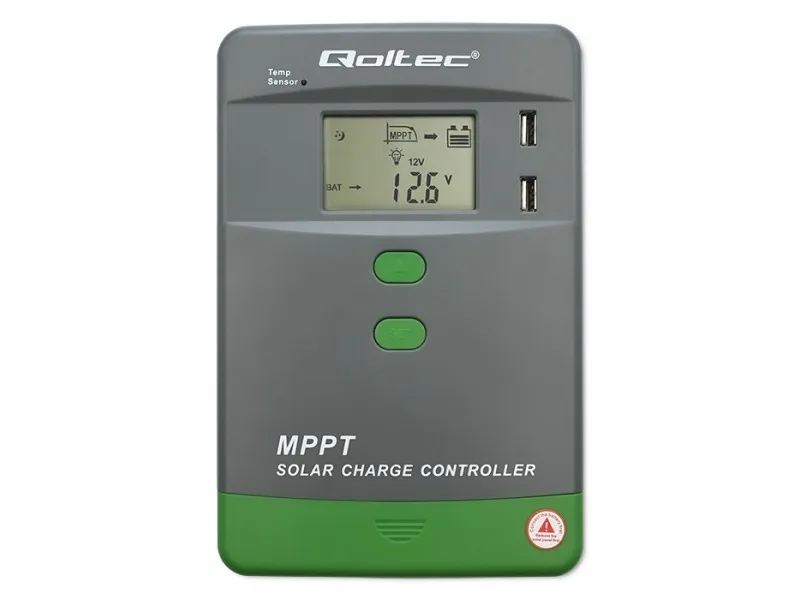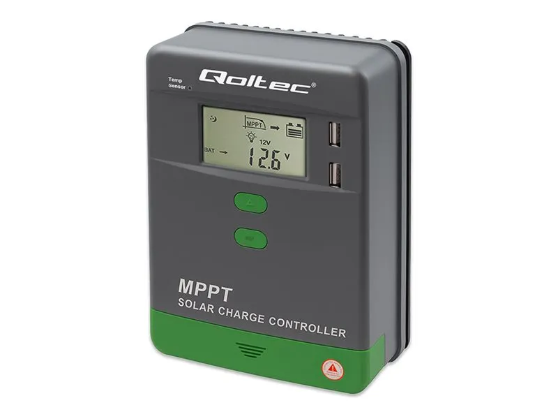 Qoltec - Solar charge controller - MPPT, 30A, 12/24V, LCD, APP, GEL, LiFePO4 - trådløs, kablet - Bluetooth - USB - grå, grønn