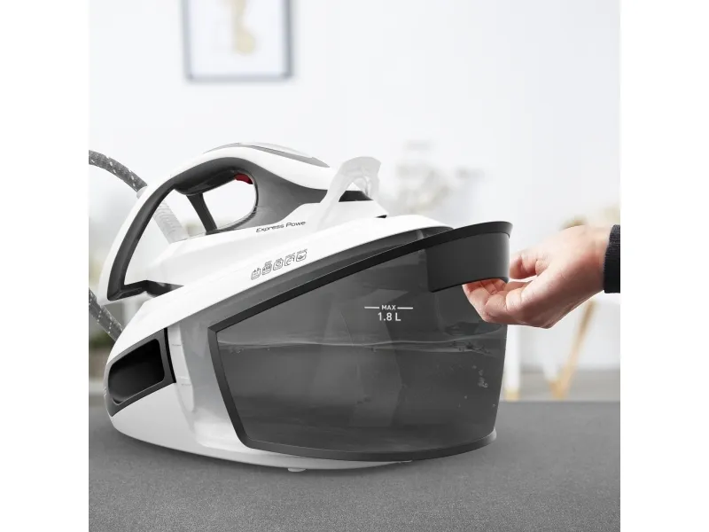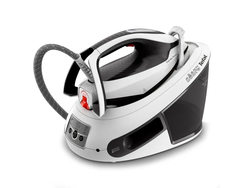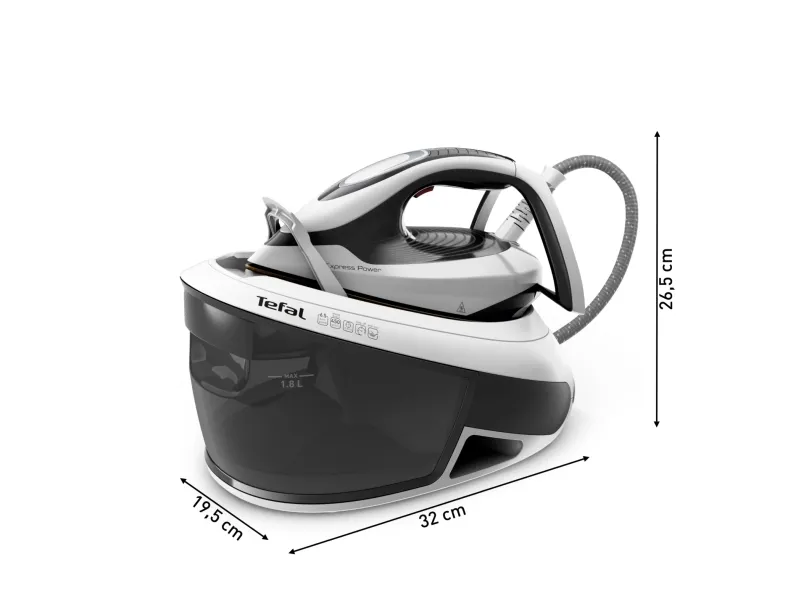 Tefal Express Power SV8130. Iron power: 2800 W, Steam boost performance: 450 g/min, Soleplate type: Durilium AirGlide Autoclean soleplate. Cord length: 1.6 m, Hose length: 1.8 m. Width: 210 mm, Depth: 360 mm, Height: 260 mm. Products per pallet layer: 8 pc(s), Quantity per pack: 1 pc(s), Layers per pallet: 3 pc(s). Power: 2800 W, Country of origin: France