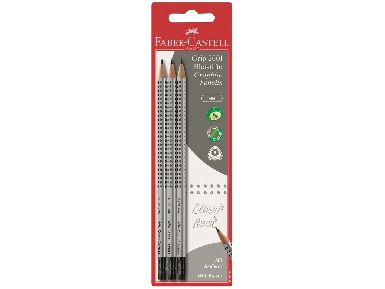 Den eneste blyanten i sitt slag i hele verden: GRIP 2001. Den patenterte Soft-GRIP-sonen forhindrer at fingrene sklir. Den ergonomiske, trekantede formen sørger for at man ikke blir trett av å skrive. Overflatebelegget er laget av miljøvennlig vannbasert maling, en teknologi som først ble introdusert av Faber-Castell. Blyet er helt sammenbundet med treomrammingen, noe som gjør det spesielt motstandsdyktig mot brudd.