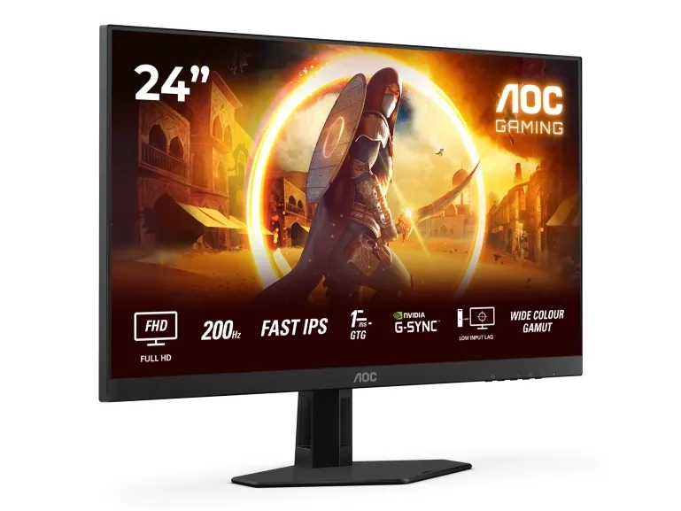 Unleash speed and precision with the 24G4HRE 200Hz Fast IPS gaming monitor The 24G4HRE delivers ultra-smooth performance with a 200Hz refresh rate and 1ms GtG response time on a Fast IPS panel, ensuring crisp and fluid visuals. With 0.5ms MPRT, low input lag, and G-Sync compatibility, every frame is razor-sharp and tear-free. HDR10 and a wide color gamut provide stunning contrast and vibrant colors for an immersive experience.AOC G4 24G4HRE. Display diagonal: 60.5 cm (23.8"), Display resolution: 1920 x 1080 pixels, HD type: Full HD, Display technology: LED, Response time: 1 ms, Native aspect ratio: 16:9, Viewing angle, horizontal: 178°, Viewing angle, vertical: 178°. Built-in speaker(s). VESA mounting, Height adjustment. Product colour: Black, Red