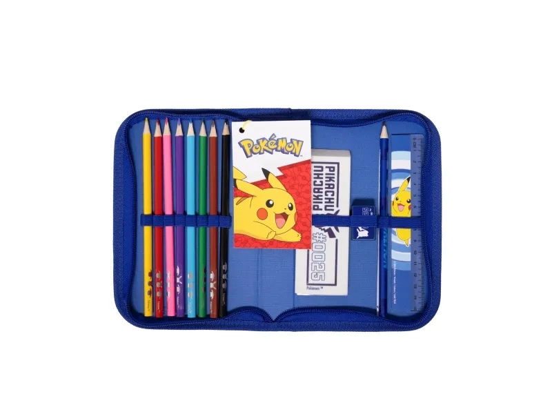 Gør skoledagen sjovere med denne fantastiske POKÉMON fyldte penalhus! Med sit farverige design og praktiske indhold, herunder 8 trekantede farveblyanter, en trekantet blyant, en blyantspidser, en 15 cm lineal og en stor viskelæder, er det perfekt til kreative børn. Det slidstærke 300D nylonmateriale sikrer, at det holder til alle eventyr. Klar til at tage med i skole eller på legepladsen!
