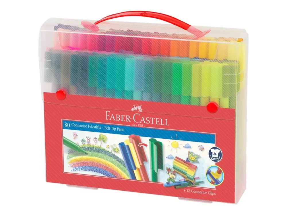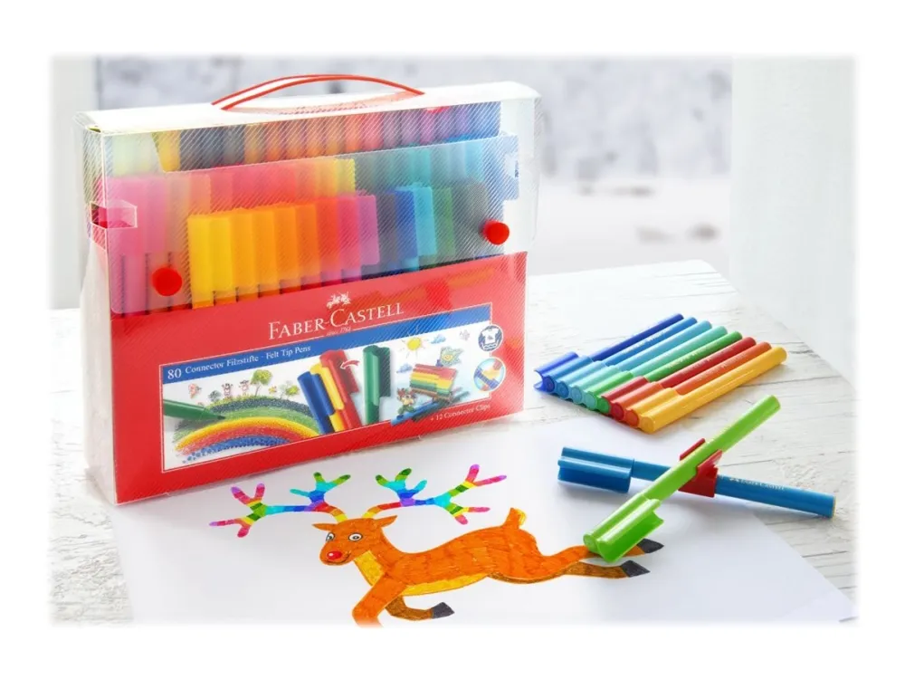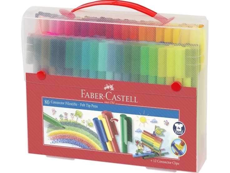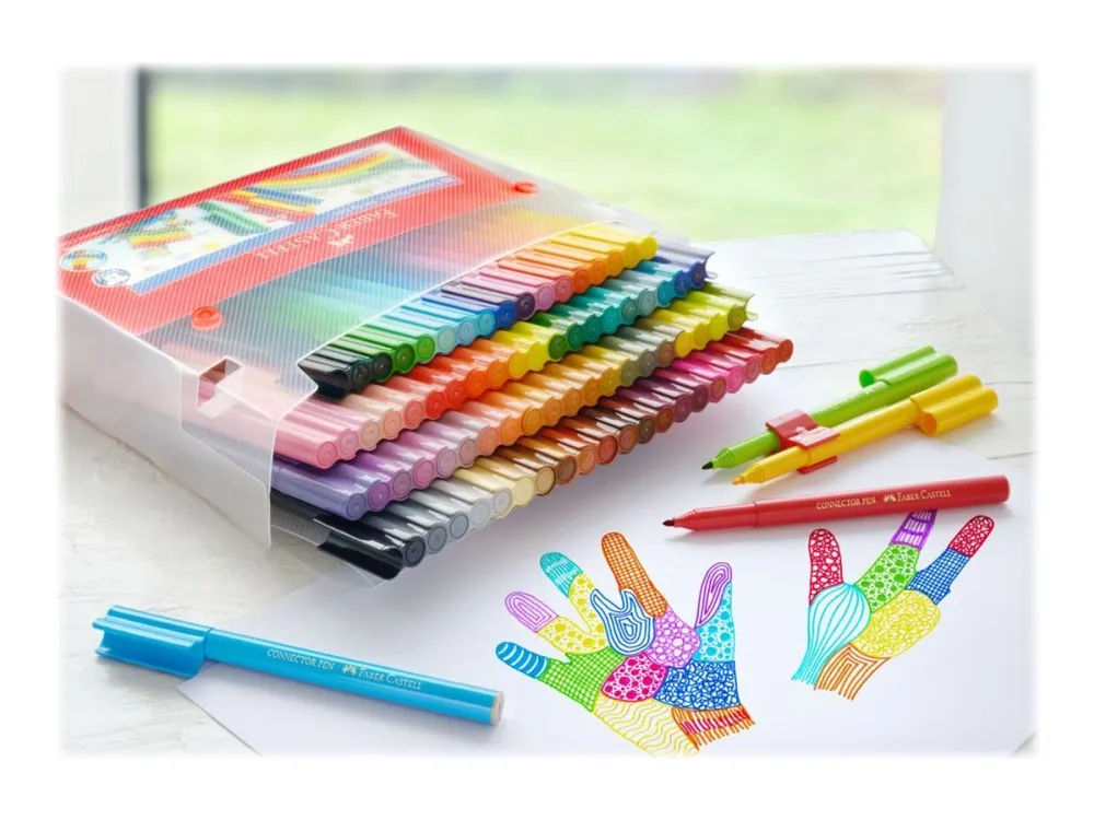 Connector pens impress with their bright, bold colors. Fantastic painting techniques provide ideas and unlimited creativity. The special clip on the cap allows the markers to be clipped together for easy organization and clean-up. The rotatable Connector clips can be used for drawing parallel patterns or imaginative crafts and games. The Connector pens are specially equipped for little artists with a short barrel and an extra thick marker tip. A stronger tip is advantageous because even with a strong writing pressure, it will not recede or break.
