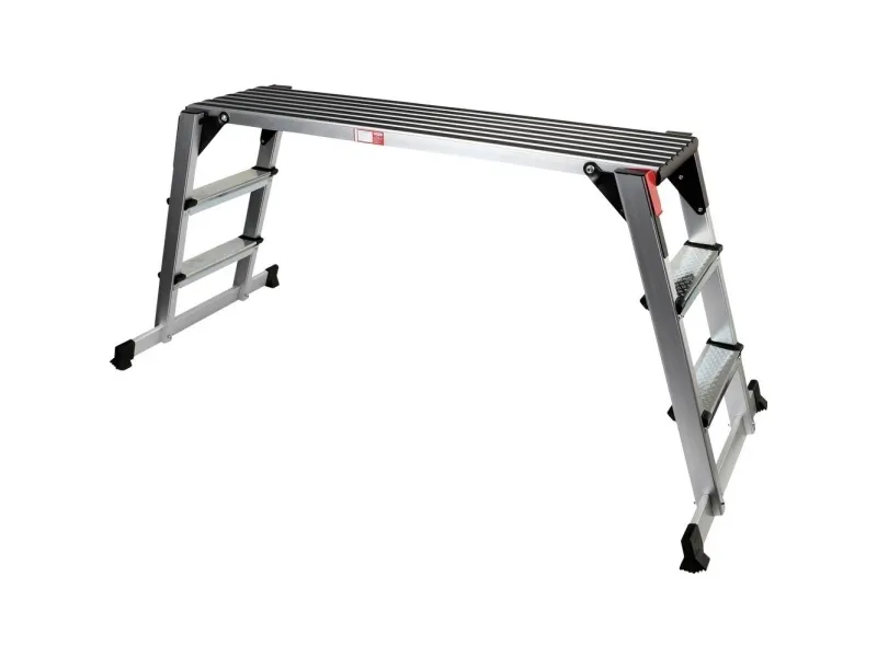 Aluminium-sikkerhedsplatform, L1650xB380xH730mm • Med skridsikker profil på kørebroen • Med riffelplade-profil på trinet • Ingen vipning med skråtstillede fødder • betrædning på begge sider • Med stor platform til sikker stand • Med sikkerhedslåse • Stolpe og trin af aluminium • kan klappes sammen og er dermed pladsbesparende at opbevare • Kunststofkanter på fødder beskytter løbeplatformen og jorden • Sikker stand letter arbejdet • Kan anvendes til vinduesmontering, motorarbejde, tagarbejde, lastbil-grubegarbejde og så videre. • universal anvendelse ved meget høje køretøjer som for eksempel autocampere, kassebiler, lastbiler, busser og terrængående køretøjer • Massiv aluminiumskonstruktion