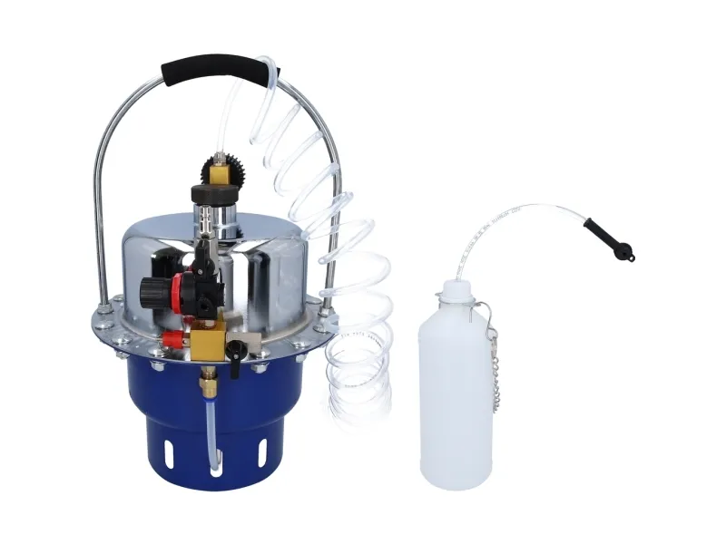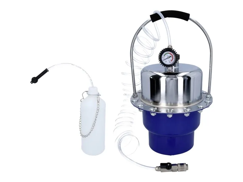 Det Brilliant TOOLS TRYKLUFTBREMSEUDLUFTNINGS-enhed BT701260 anvendes til udluftning og skift af væsker i bremsesystemer og hydrauliske systemer. Bremsesystemets væske kan således skiftes inden for få minutter, uden at der er risiko for luftindtag. Arbejdstrykket kan reguleres fra 0-3 bar via trykregulatoren på 5 liter og aflæses på manometeret. En 1L opsamlingsflaske til bremsevæske, som aftappes ved udluftningsnippel, medfølger.