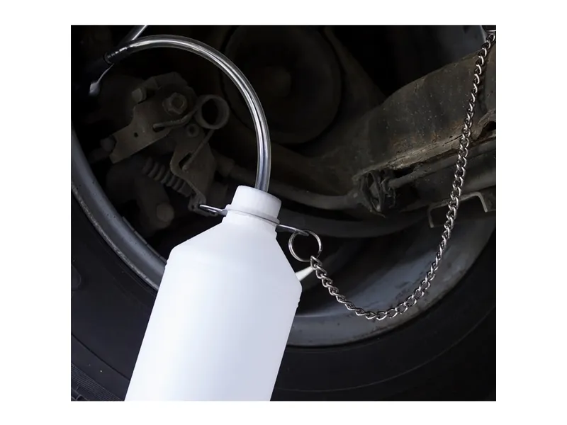 Trykluft-bremseapparat med drypflaske • Trykluftunderstøttet udluftning af bremse- og koblingssystem • Bremsevæske og trykluft er adskilt af en membran • Arbejdstrykket kan justeres via trykregulator fra 0 - 3 bar og kan aflæses på manometeret • Lynkobling ved påfyldningsslangen til nem montering af adapteren • Tilslutningsslange med lynkobling, længde 6 meter • Med sikkerhedsventil • 5 liter bremsevæskebeholder • Inklusive 1L opsamlingsflaske