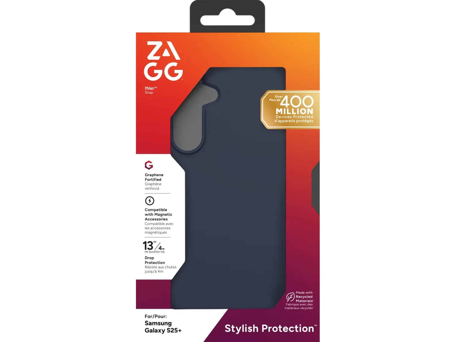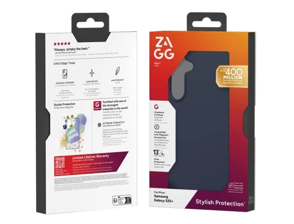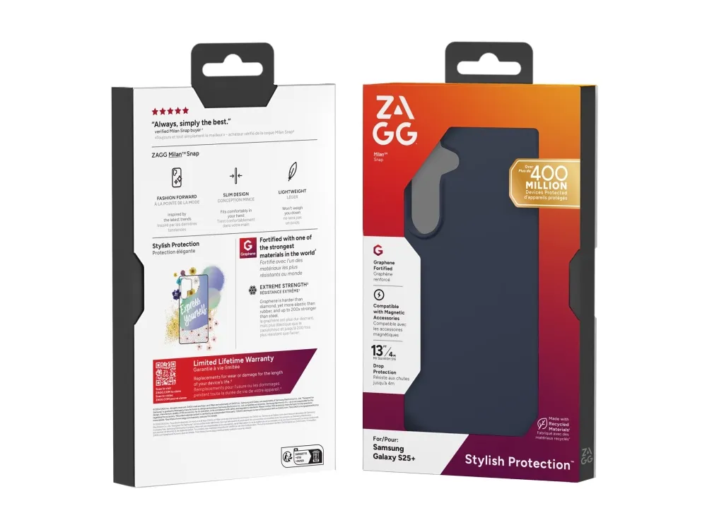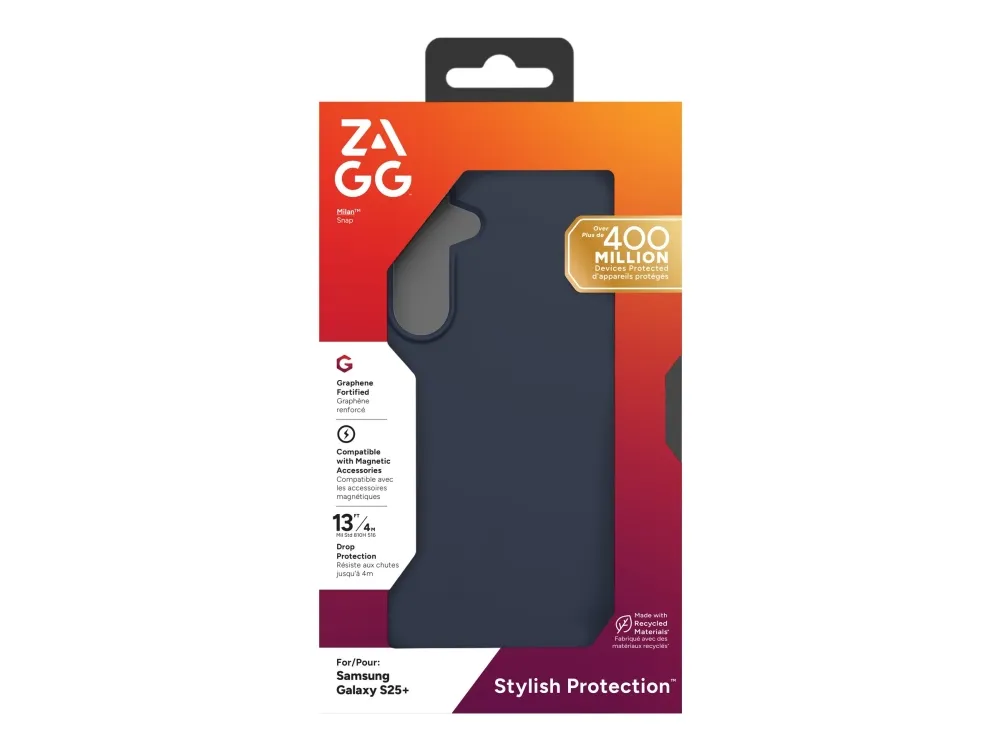 The interior lining is made of advanced graphene material, which supports wireless charging, ensuring that your device stays charged without the hassle of removing the case. The case is also eco-friendly, featuring 84% recycled content from post-consumer materials. Choose the ZAGG Milan Snap for reliable protection coupled with sustainable practices.
