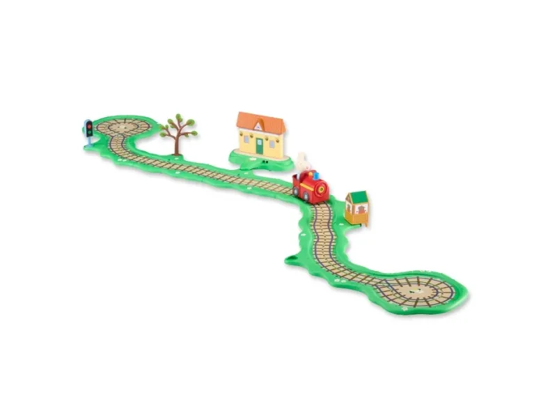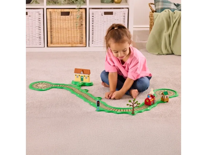 Peppa Pig Whizz-Around Clickety Clack Togbane-sæt indeholder Rebekka Kanins lille røde tog, sammen med et togbanesæt, tilbehør og en togstation med bevægelsesaktiverede lydeffekter! Banen samles med et simpelt puslespilsystem, som er perfekt for små hænder at sætte sammen. Tilpas banen med det medfølgende tilbehør – og tryk på knappen på toget for at sende Rebekka afsted! Når toget passerer stationsbygningen, aktiveres musik, sætninger og sjove lyde!