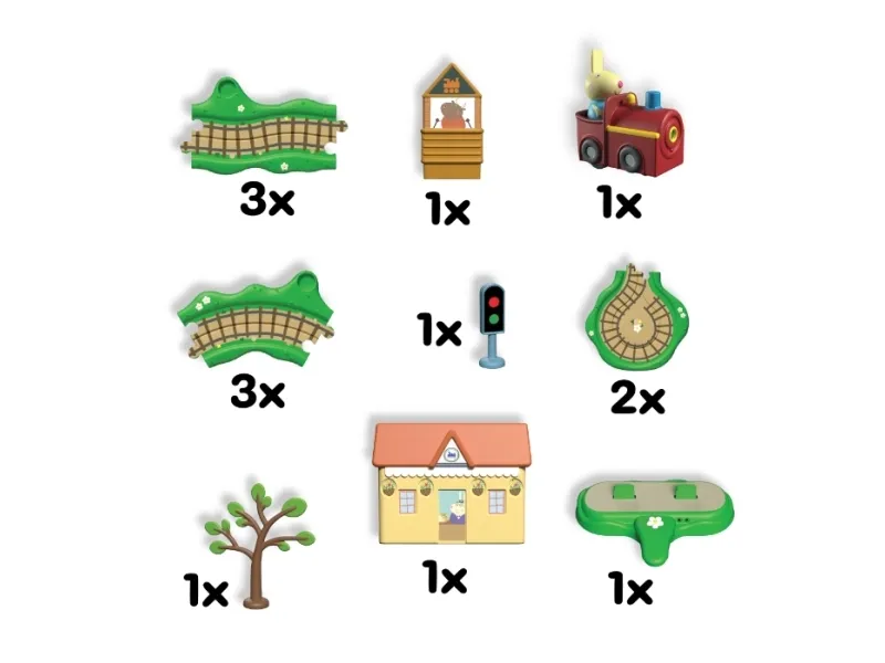 Inkluderet: 6 x stykker togskinner 2 x buede togskinner 1 x Rebekkas lille tog 1 x signalhytte med Hr. Tyr 1 x togsignal 1 x træ 1 x togstation 1 x elektronisk bundplade 4 x AAA batterier (medfølger ikke) Alder: 2+