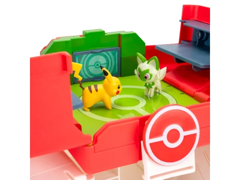 Åbn kassen for at fremvise dit hold eller træn i den indbyggede tag arena. Den er udstyret med tilskuerrækker og en roterende kampplads. Sættet leveres med to Battle figure af Pikachu og Sprigatito, så du kan komme godt i gang med dit eventyr. Når du er klar til at drage videre, lukker du blot kassen sammen og bruger håndtaget til at tage dit hold med. Et officielt licenseret Pokémon-produkt fra Jazwares.