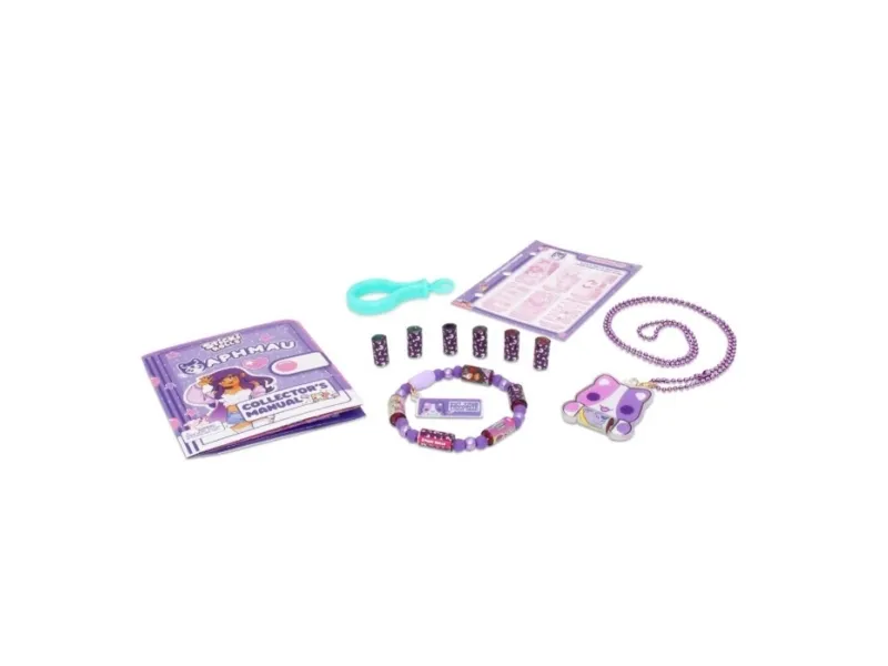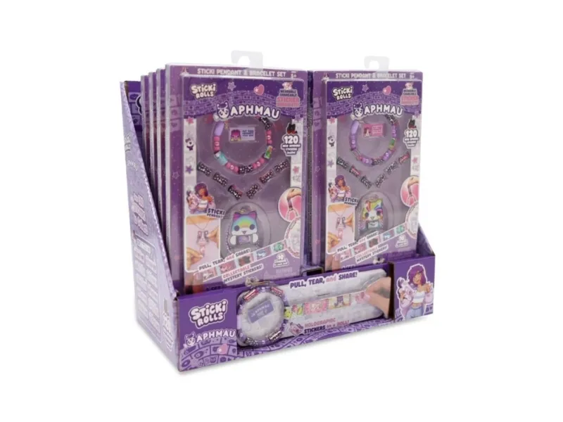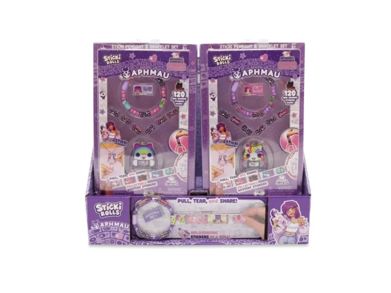 Indeni finder du et strålende holografisk vedhæng, der kan opbevare dine yndlingsklistermærker, så du altid har dem med dig, samt et armbånd klar til at bære – så du kan style dig i ægte Aphmau-mode. Med 12 unikke Sticki Rolls inkluderet, hver med søde illustrationer og overraskelseskarakterer, kan du klæbe, dele og bytte dig igennem dagen.