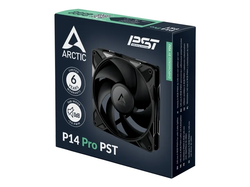 The ARCTIC P14 Pro PST is designed to enhance airflow and cooling efficiency in various applications. With a 140 mm fan diameter and a height of 27 mm, it delivers performance while maintaining a low noise level. Featuring a rotation speed range of 400 to 2500 rpm, this fan adapts to different thermal demands, ensuring optimal cooling in any environment.
