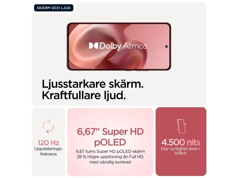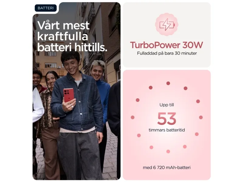 Motorola Moto G86 Power kombinerer ytelse og holdbarhet med et elegant design. Den har en batterikapasitet på 6720 mAh, som gir langvarig bruk støttet av TurboPower-teknologi for rask lading. Den 6,67-tommers P-OLED-skjermen gir levende farger og en oppslukende seeropplevelse med en HD-oppløsning på 2712 x 1220 piksler, forbedret av en adaptiv oppdateringsfrekvens på 120 Hz for jevn rulling og spillopplevelse.
