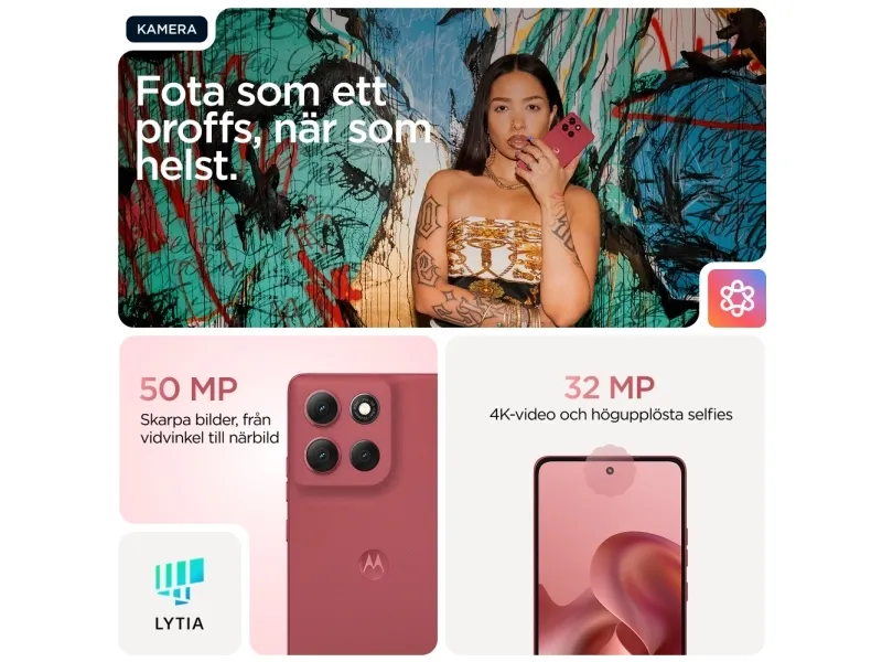 To mikrofoner, Gesture Controls, doble stereohøyttalere, Circle to Search, RAM Boost, moto ai, Family Space, Smart Connect, Moto Unplugged, Quick Launch, Gametime