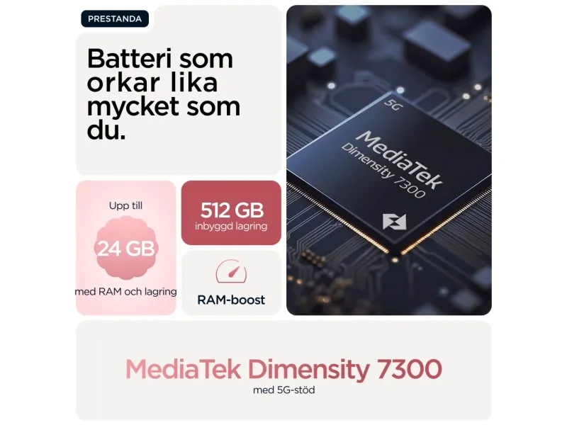 Enheten er utstyrt med en 8-kjerners MediaTek Dimensity 7300-prosessor og 8 GB RAM, og håndterer multitasking sømløst. Fotografer vil sette pris på de to bakkameraene, inkludert en 50 megapiksel hovedsensor med optisk bildestabilisering og et makrokamera for detaljerte nærbilder. I tillegg gjør funksjoner som IP68-vann- og støvmotstand denne smarttelefonen til et robust valg for daglig bruk, mens funksjoner som 5G mobilt bredbånd sikrer rask tilkobling uansett hvor du er.