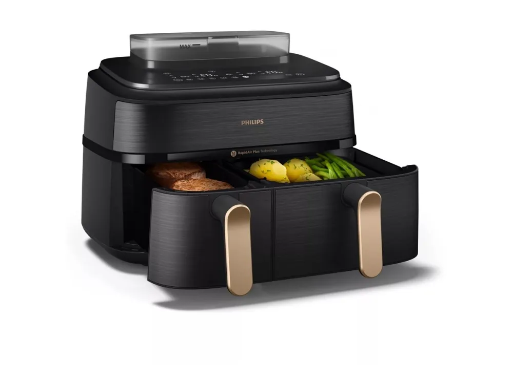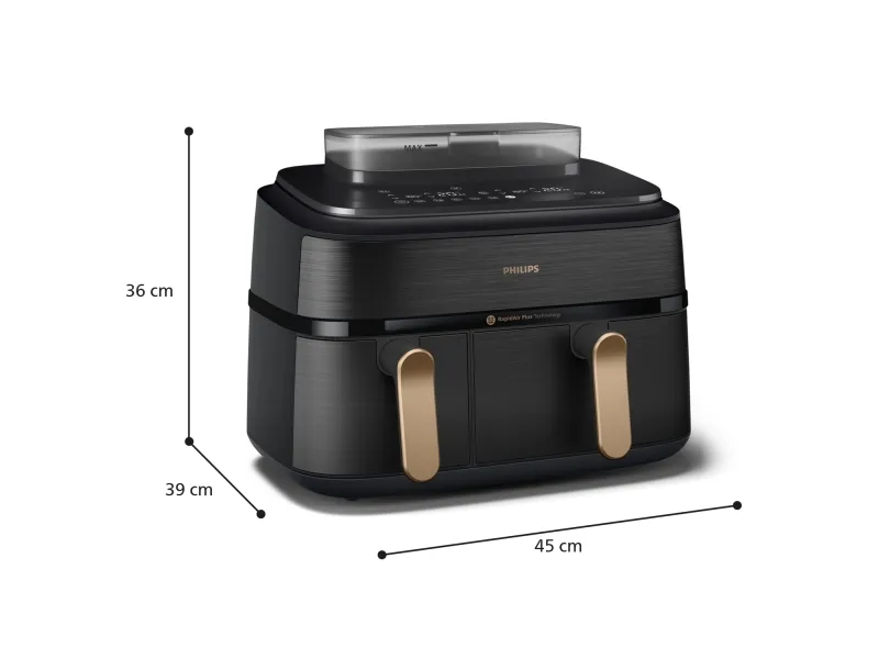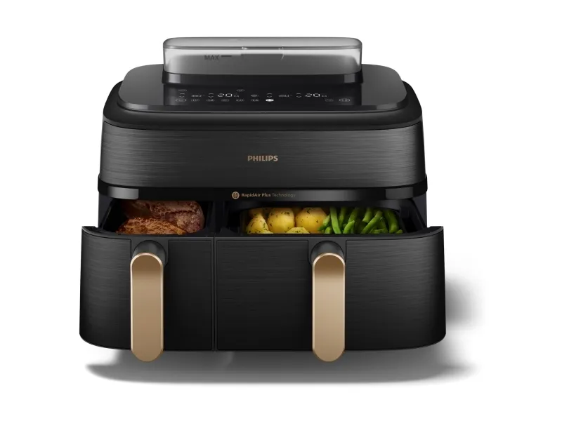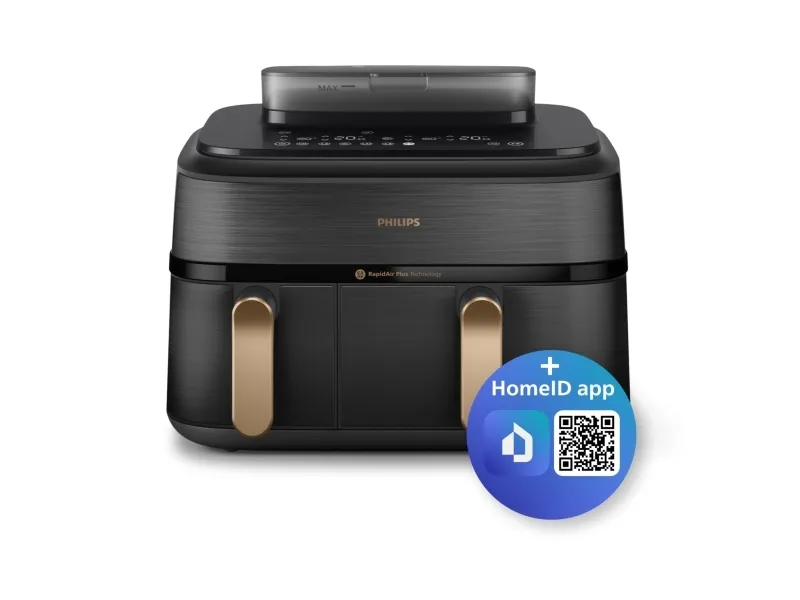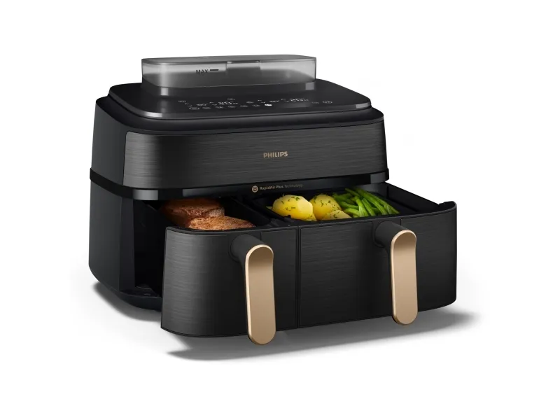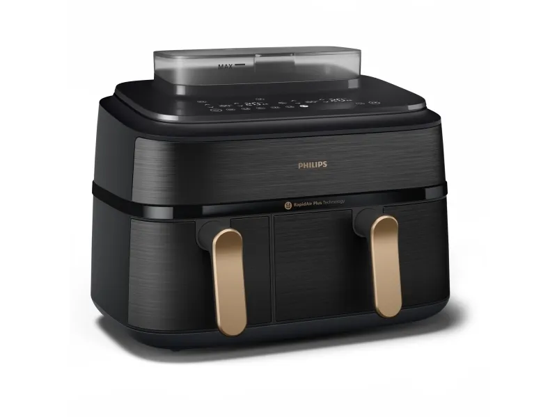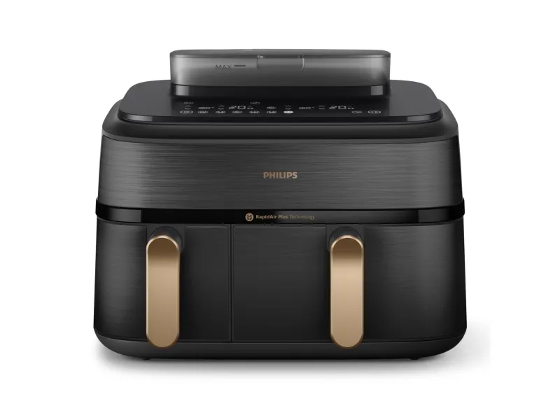 The Philips 5000 Series NA552 double hot air fryer delivers versatile cooking options with its 9-liter capacity and a maximum temperature of 200°C. Utilizing Rapid Air Plus technology, this appliance allows for healthier meal preparation, enabling users to fry, bake, grill, and roast with little to no oil. With the added convenience of a touch-sensitive control panel and a timer capable of measuring up to 60 minutes, this fryer ensures precise cooking for various recipes. It features an automatic switch-off function for safety, while the non-stick coating facilitates easy cleaning after cooking. The inclusion of multiple programs, along with a keep warm and reheat function, makes this fryer an addition to any kitchen, promising delicious and effortlessly prepared meals.