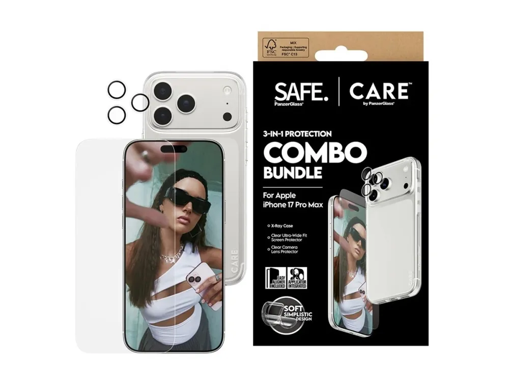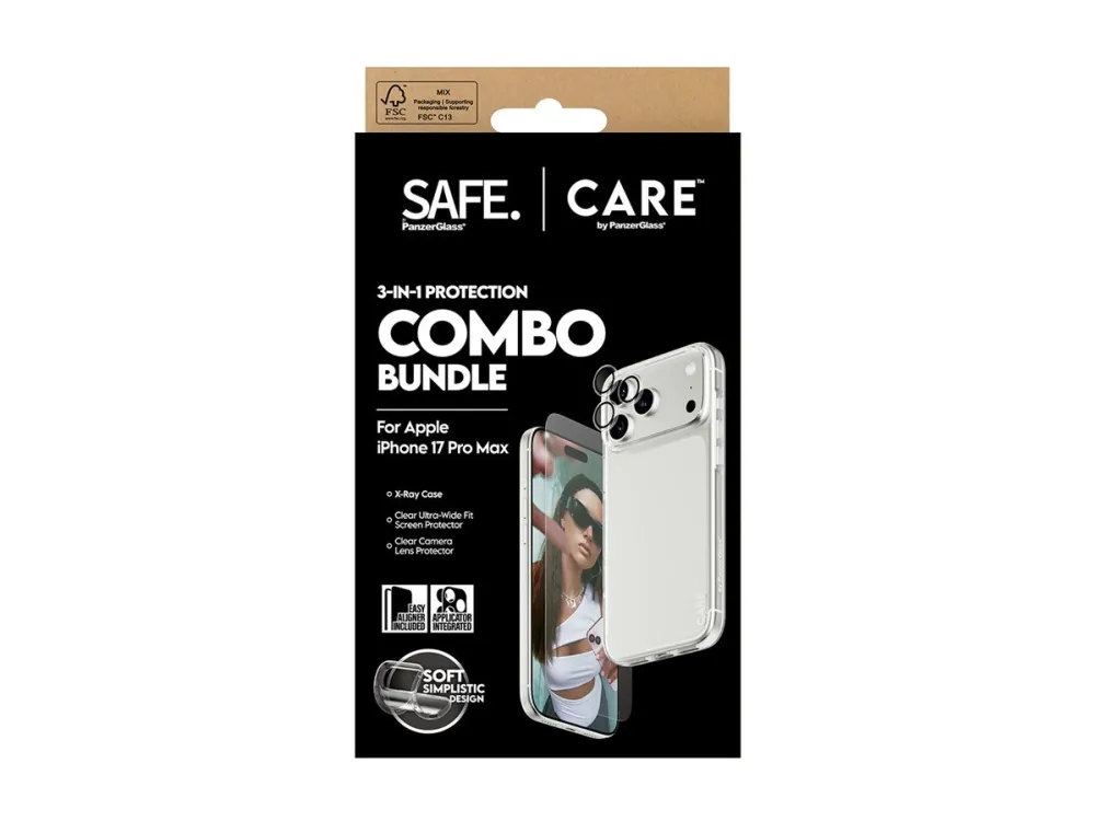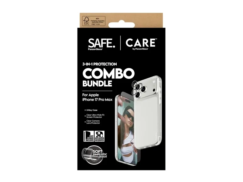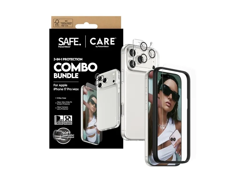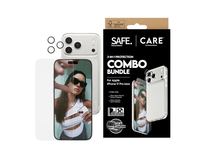Protect your phone in style with the CARE by PanzerGlass Fashion 3-in-1 Combo Bundle. Designed for when you prioritize both fashion and security, this bundle keeps your phone safe while making a statement. The bundle includes:SAFE by PanzerGlass Screen Protector Ultra-Wide Fit: Made from 60% recycled materials, this screen protector absorbs impacts and prevents scratches, all while preserving your screen's clarity and touch responsiveness. It's Ultra-Wide Fit provides full front coverage, ensuring peace of mind with every swipe.SAFE by PanzerGlass Transparent Camera Lens Protector: Keeps your camera lenses safe from scratches and damage, so you can continue capturing sharp, high-quality photos.CARE by PanzerGlass Fashionable X-ray Case: More than just protection, this case blends sleek, transparent design with solid durability. Made from recycled materials, it lets your phone's beauty shine through while offering a comfortable grip and top-notch protection from everyday bumps and drops.Installation is also easy. Just mount the screen protector using the enclosed EasyAligner apply the camera lens protector, and click on the case. To make it even easier, we've included step-by-step instructions as well as a QR code for quick access to our online how-to video. And once everything is installed, you'll never again fear the sight of your phone tumbling to the ground. This may not happen, but if it does, you'll regret not having clicked "add to cart".