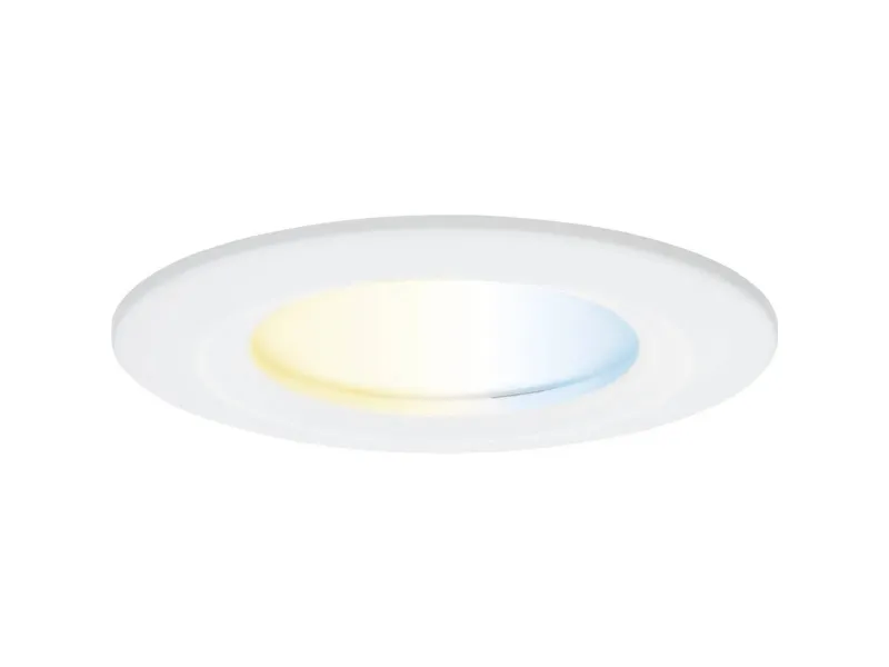 Led-indbygningslampe Nova Coin IP44 rund 78mm Tunable White 6W 530lm 230V hvid mat aluminium Det smarte indbygningslamper sæt Nova Coin i hvid, mat med farveskiftfunktion skaber en individuel boligindretning i alle rum. Der medfølger en udskiftelig LED-lyskilde inklusive førsteklasses aluminium-indbygningsring. Med den særligt høje IP-beskyttelse af IP44 er lamperne også ideal for fugtige rum og er beskyttet mod vandsprøjt. Med en effekt på 6 Watt og ZigBee 3.0-styring er der en effektiv og innovativ belysningsløsning. ZigBee 3.0 er en radiotransmissionsprotokol, der forbinder enheder fra forskellige producenter med hinanden. På denne måde kan du styre lamper enkeltvis eller samlet via app, fjernbetjening eller talekommando: Uanset om der er tale om en hyggelig varm guldbelysning (2200K) eller lysstærkt dagslys-hvid (6500K) - via Tunable White funktionen kan lysets farve indstilles trinløst efter behov. Den trinløse dæmpningsfunktion muliggør en individuel tilpasning af lysstyrken og sørger for et lyst arbejdslys og en hyggelig dagligstuebelysning. De smarte indbygningslamper kan nemt og bekvemt tændes og slukkes via en almindelig lyskontakt. Den integrerede memory-effekt husker altid den sidst anvendte lysindstilling - for maksimal komfort. Monteringen er særlig let og effektiv takket være den kæde, der kan sammenkædes og udskiftes, den lille indbygningsdybde på kun 45 mm og den direkte 230 V-tilslutning.