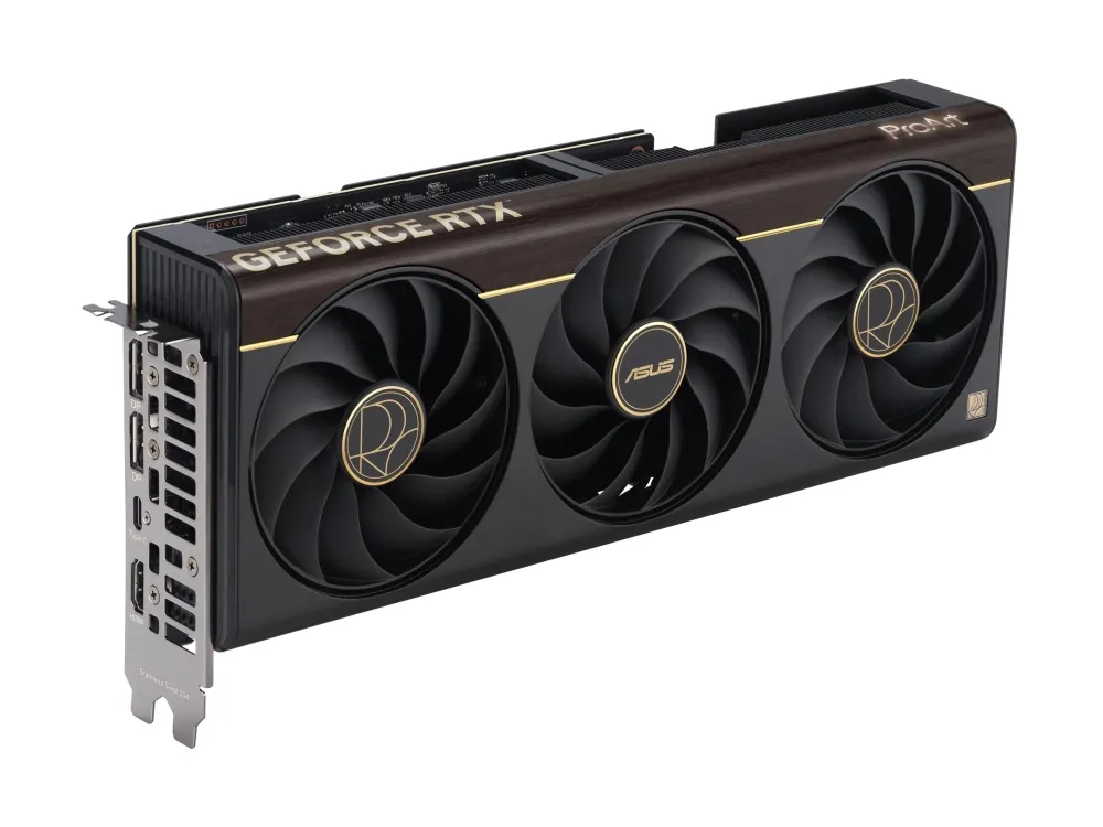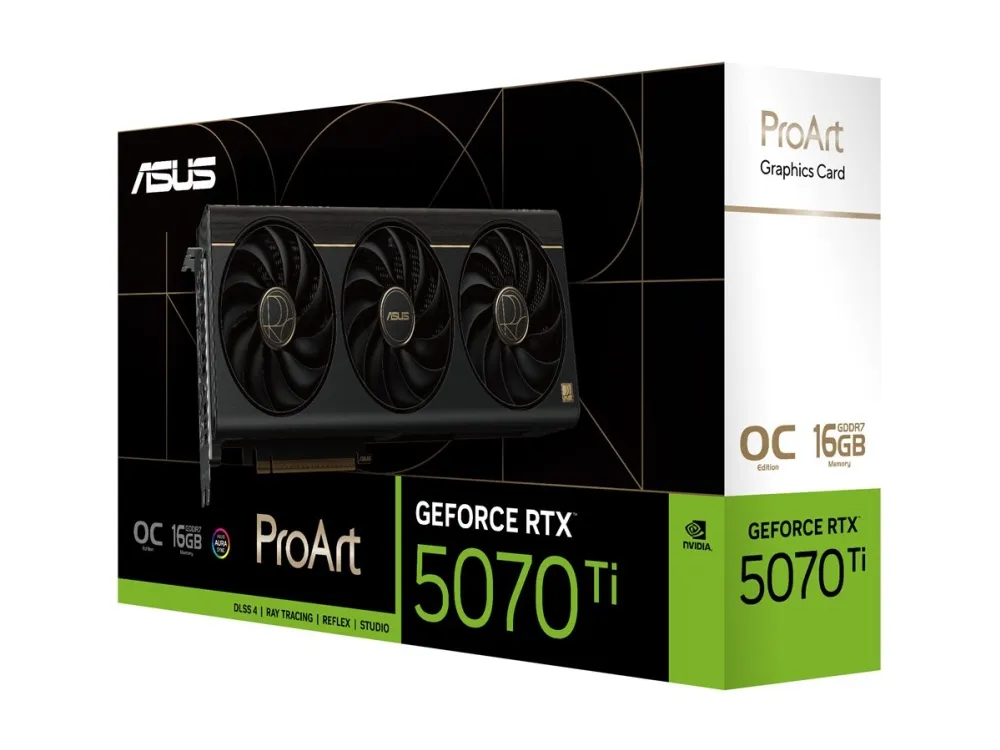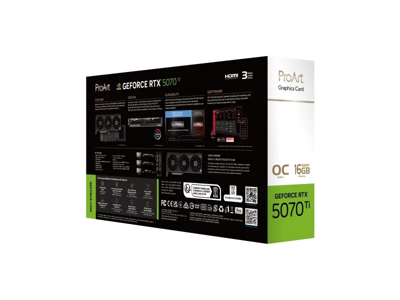 The ASUS ProArt OC Edition graphics card is designed for high-performance gaming and professional use. Equipped with an NVIDIA GeForce RTX 5070 Ti processor, this card provides impressive graphics capabilities, enabling users to enjoy stunning visuals at a maximum external resolution of 7680 x 4320. With 16 GB of GDDR7 SDRAM and a bus width of 256-bit, it supports various tasks smoothly while pushing the limits of performance during demanding applications. The card features a triple fan design with advanced cooling technologies, such as vapor chamber cooling and 0dB technology, ensuring optimal thermal management for uninterrupted operation. Featuring multiple output ports including HDMI, DisplayPort, and USB-C, the ASUS ProArt card allows for multi-monitor setups, supporting up to four displays simultaneously. Its technologies like NVIDIA G-Sync and NVIDIA DLSS 4 enhance gameplay experiences by providing seamless visuals and improved frame rates. The card also boasts durability features such as dust resistance and moisture resistance, making it a robust choice for creators and gamers looking to elevate their experience.
