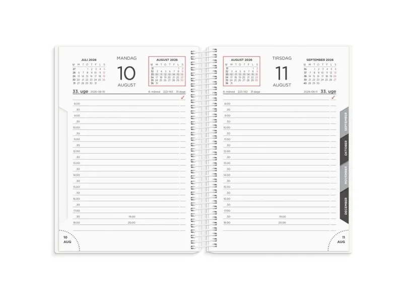 Klassisk spiralkalender. Kalenderen er spiralbundet med et omslag i hård PP-plast, hvilket giver kalenderen et enkelt udseende. Kalenderen er inddelt med en dag pr. side og indeholder et kalenderskema med halvtimeinddeling fra kl. 8-20, så du nemt kan danne dig et overblik over dagens planer og aftaler. Dertil finder en udfoldelig årsoversigt, masser af skriveplads, praktiske informationer samt hjørneperforering og månedsregister, som sikrer hurtige opslag i kalenderen.
