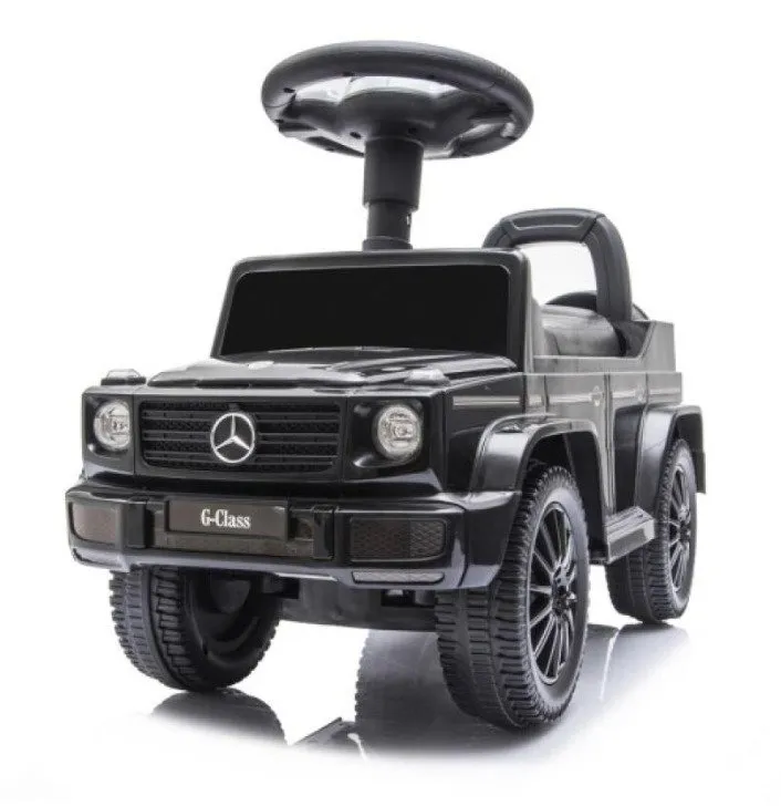 Flot gåbil på licens fra Mercedes-Benz. Modellen G350D fra NORDIC PLAY leveres i en stilfuld sort farve med realistisk design. Der er horn og motorlyde indbygget i rattet. Med aftagelig ryglæn og reservehjul til pynt. Der er desuden opbevaringsrum til legetøj. Kan både bruges ude og inde. Rattet bruger 2xAA batterier. Medfølger ikke.