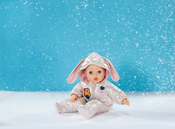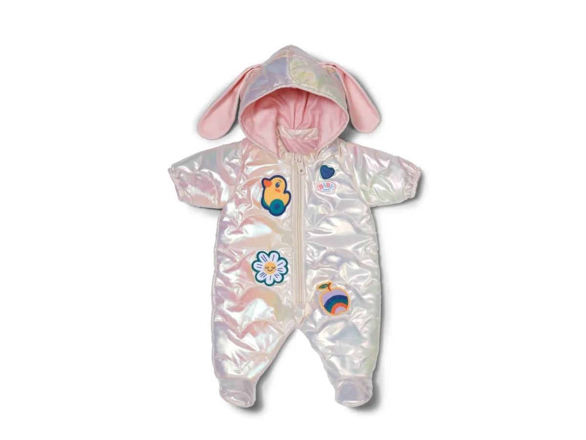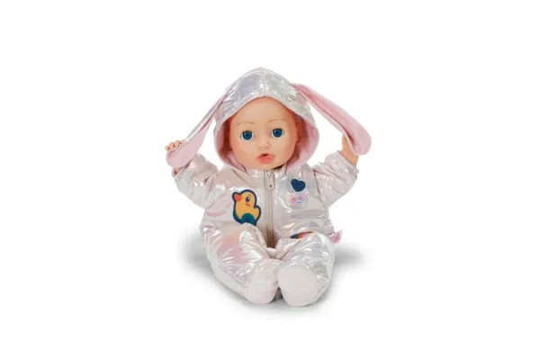 This snowsuit for 43 cm tall dolls is perfect for cold days! With its cream-coloured metallic look and the cute bunny ears on the hood, BABY born cuts a stylish figure on the slopes.BABY born Winter Suit Cream 43cm. Product type: Doll playsuit, Recommended age (min): 3 yr(s), Foldable