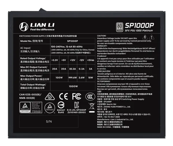 Varenr.: [24628241] | Producent: Lian Li Industrial Company | Model-nr.: SP1000P Black | EAN: 4718466019769