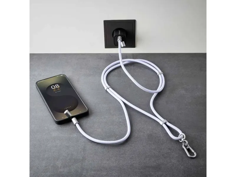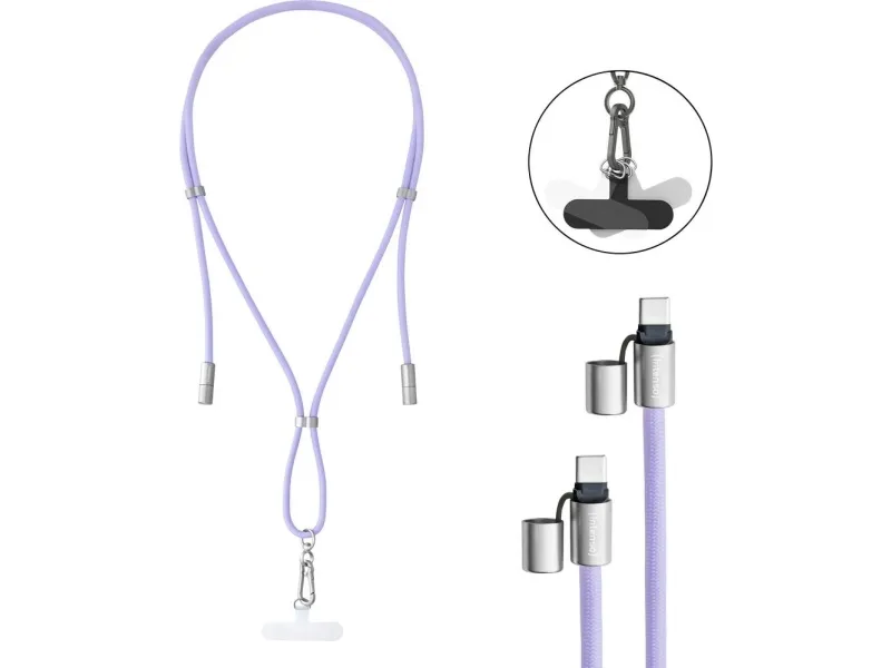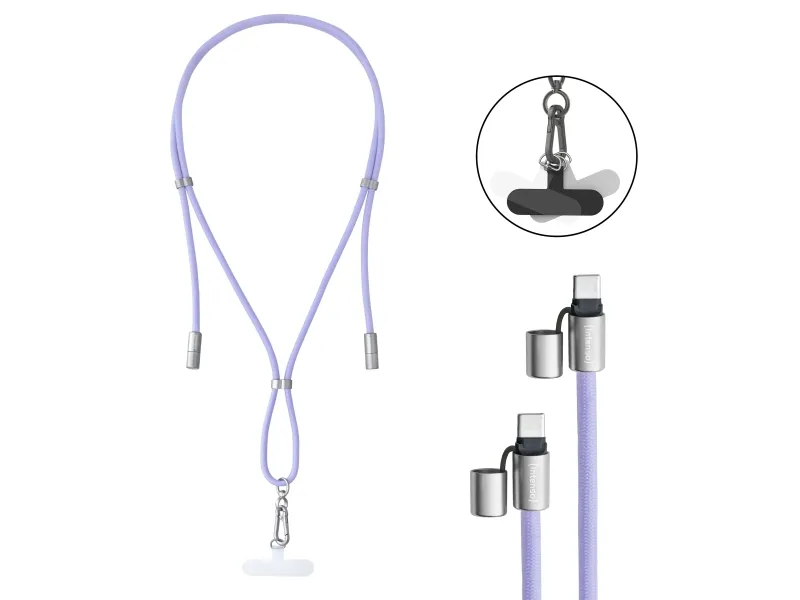 This versatile cell phone lanyard doubles as a high-speed USB-C to USB-C charging and data cable. With a 1.65 m length, 60 W fast charging support (PD 3.0 / QC 4.0), and durable nylon build, it's perfect for everyday mobility. Whether at work, shopping, or traveling, your phone stays secure and powered. Includes three attachment loops (black, white, transparent) for easy device integration.Intenso USB-C Charging Lanyard – Phone Necklace Cable, 60W Fast Charging, Adjustable Length, 1.65 m Nylon, USB-C to USB-C, purple. Cable length: 1.65 m. Connector 1: USB C, Connector 2: USB C, Product colour: Purple