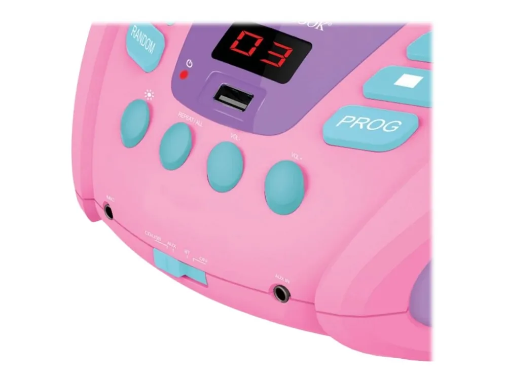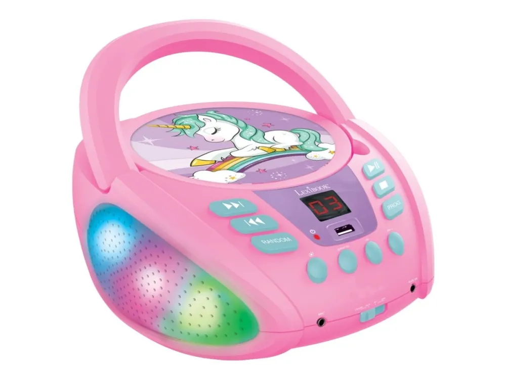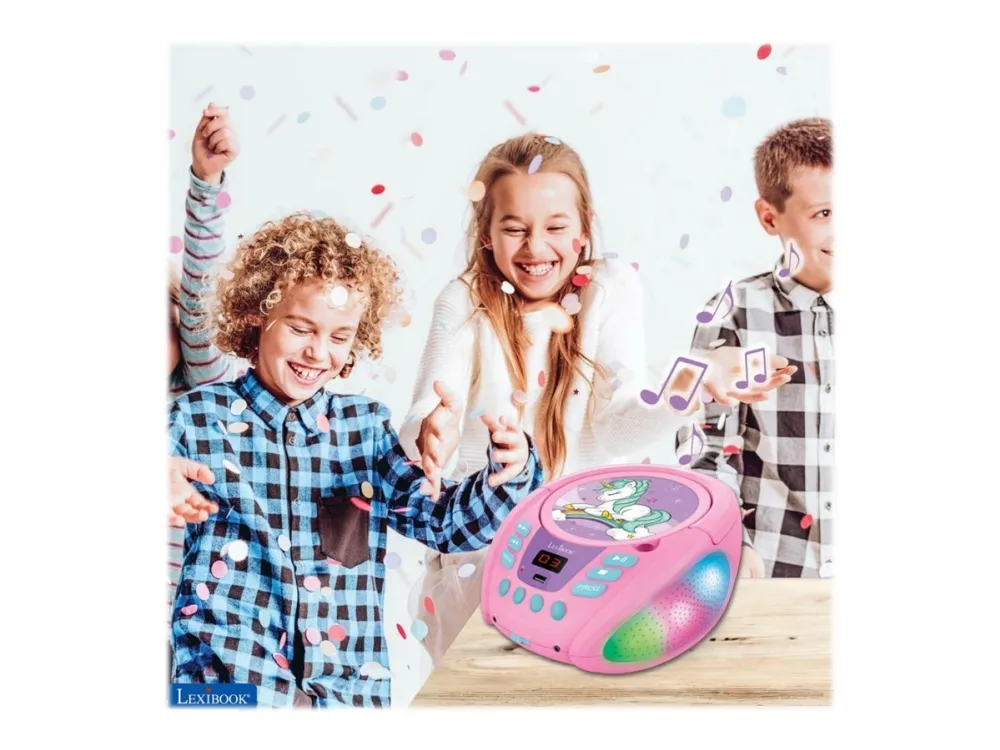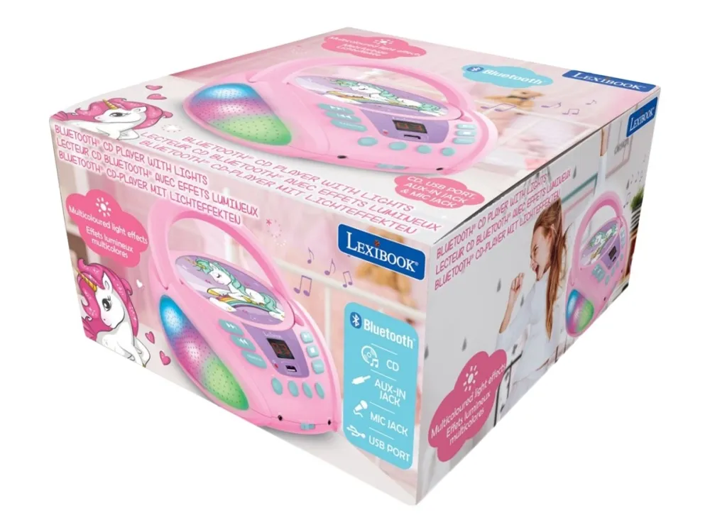 Discover the enchanting world of music with the Lexibook Unicorn RCD109UNI boombox. This device is not just a means to play your favorite tunes; it's a gateway to an immersive audio experience, complemented by captivating LED lighting effects. With Bluetooth 5.0 compatibility, it offers the convenience of wireless streaming, allowing you to play music from your smartphone, tablet, or any Bluetooth-enabled device. The boombox supports various media types including CD-DA, CD-R, and CD-RW, ensuring your cherished music collection never gathers dust. Stereo sound output through two built-in speakers ensures a rich listening experience, whether you're enjoying quiet melodies or pumping up the party. Moreover, its dual power source capability means you can keep the music going whether you're near an outlet or on the move. The Lexibook Unicorn boombox is your all-in-one solution for music playback, blending functionality with an enchanting design.