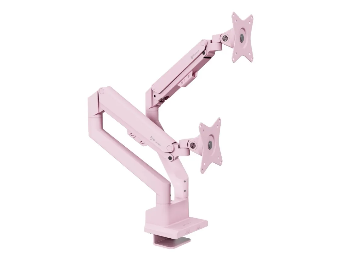The Arozzi Alzare Neo Duo monitor arm is designed to support two monitors side by side. It fits seamlessly with any desk setup, especially our Arena Desk series. The cable management cut-outs in the Arena desktop make it easy to mount both arms and keep cables neatly organized. This fully adjustable dual arm is simple to install and ideal for boosting productivity in both professional environments and home offices.Arozzi AZ-ALZARE-NEO-DUO-PP. Maximum weight capacity: 18 kg, Minimum screen size: 43.2 cm (17"), Maximum screen size: 81.3 cm (32"), Minimum VESA mount: 75 x 75 mm, Maximum VESA mount: 100 x 100 mm. Height adjustment, Swivel angle range: 90 - 90°, Tilt angle range: 45 - -45°. Product colour: Purple