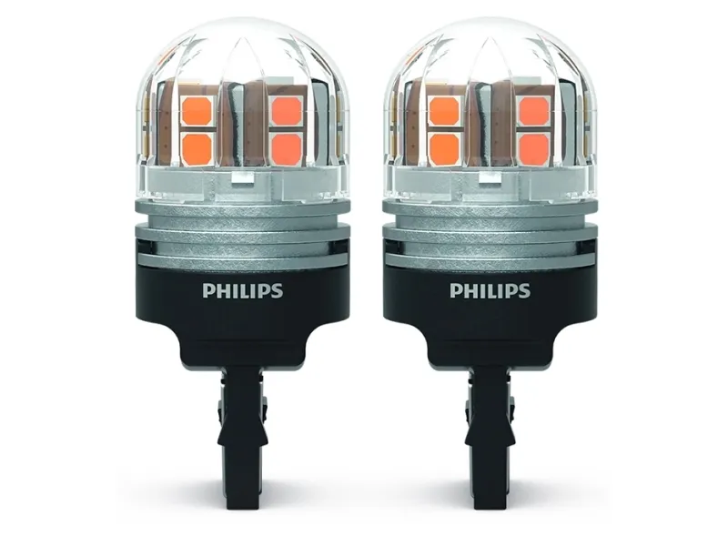 Philip Ultinon Pro7000 W21/5W Gul - 2 stk. Philips Ultinon Pro7000 LED-signalpærer giver enestående visuel komfort og en mere sikker kørsel. De levende farver og det skarpe, gule lys forbedrer øjeblikkeligt førerens synlighed. Sammenlignet med glødepærer lyser Philips Ultinon Pro7000 LED'er øjeblikkeligt op for at sikre, at andre chauffører kan reagere hurtigere, så du er mere sikker. Pæren giver en ensartet fordeling af lyset i dine blinklys, baklys, tågebaglys og stoplys. Dens 360 graders vinkel sikrer, at lyset projiceres derhen, hvor du har brug for det. Du kan ikke blot se mere af vejen, men andre bilister kan også se mere af dig.