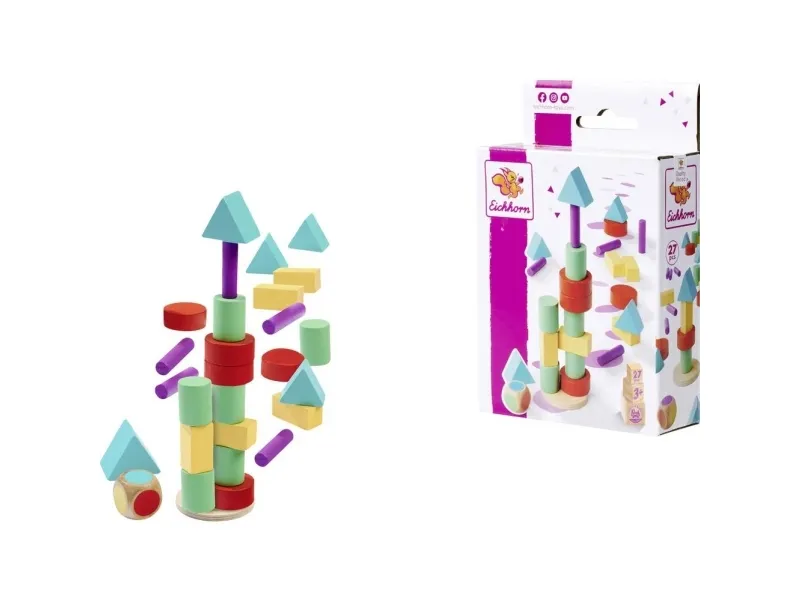 EH Games stabelterning Med Eichhorn stabelspillet oplever børn fra 3 år ikke kun masser af sjov, men fremmer samtidig deres motoriske evner og forståelse for farver og former på en legende måde. Sættet består af 26 eksklusive trækomponenter i forskellige former og farver samt en farveterning. De afrundede hjørner og den ideelle størrelse på elementerne sørger for, at også små hænder kan gribe klokkene og stables sikkert uden besvær. Legeprincippet er enkelt: Krybegang, opdag farven, og stabel den passende sten på tårn! Men pas på - falder tårnet om, taber spilleren. Her er der brug for koncentration og fingerspidsfornemmelse! Med Eichhorn stabelspillet lærer børn at skelne farver og former på legende vis og træner samtidig deres evner. Perfekt til fælles spiltimer med hele familien - sjov og læring i ét!