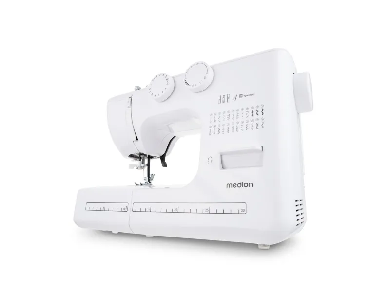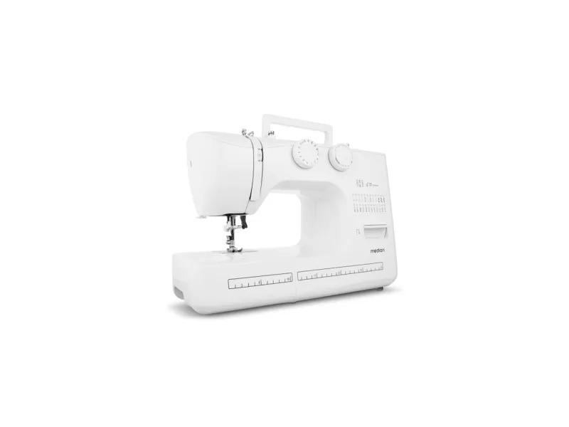 MEDION LIFE SM60. Product colour: White, Sewing machine functions: Sewing, Stitch length: 4 mm. Power supply type: Electric, Power: 60 W. Width: 420 mm, Depth: 170 mm, Height: 300 mm. Number of bobbins: 3 pc(s). Warranty period: 2 year(s)