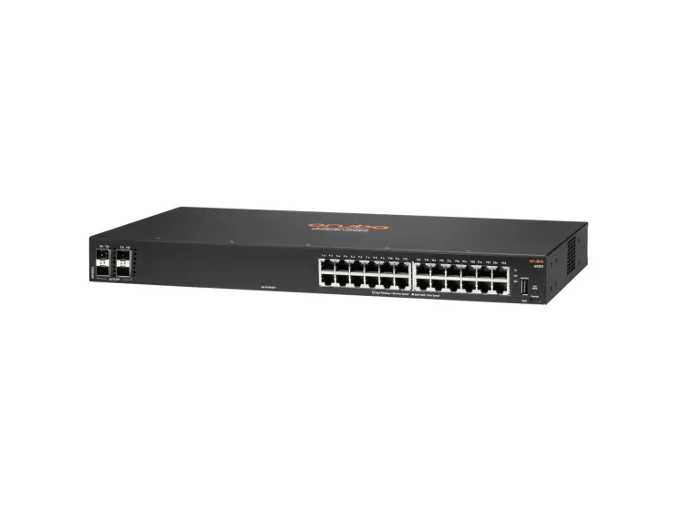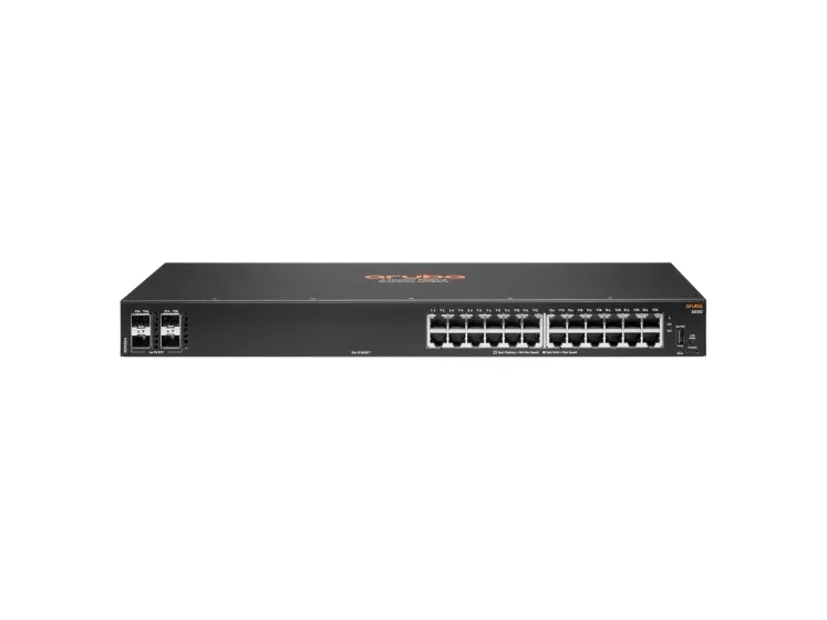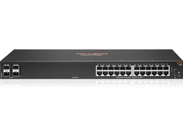 The HPE Aruba Networking CX 6000 Switch Series is modern family of entry level access switches ideal for branch offices, midsize businesses, and small enterprises. Designed for reliable, simple, and security-enhanced access, the HPE Aruba CX 6000 series provides a convenient and cost-effective wired access solution for networks supporting IoT, mobile, and cloud applications. The HPE Aruba Networking CX 6000 Switch Series is based on the Aruba ASIC architecture with the programmable AOS-CX operating system used across the entire Aruba CX portfolio for a more consistent, more efficient operator experience. This fully-managed series has convenient built-in uplinks with up to 740W of Class 4 PoE to support IoT devices such as security cameras and wireless APs. A compact and fanless model is ideal for use in quiet, small work spaces. The HPE Aruba CX 6000 series is easy to deploy and use with flexible management choices, allowing the best fit for your business and network environment.