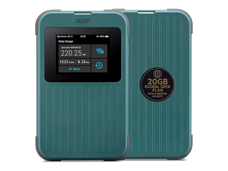 The Acer Connect M4 is designed for mobile connectivity, featuring a lithium-ion battery with a capacity of 8000 mAh to keep you powered on the go. Equipped with a 2.4" touch screen display and 8GB of flash storage, it provides an intuitive user experience while facilitating easy access to your data. The device complies with IP68 and MIL-STD-810H standards, ensuring durability in various environments, making it an ideal companion for both work and play. This mobile hotspot supports multiple cellular protocols, including 5G NR, LTE, and 4G LTE, allowing connectivity across networks. With the ability to connect up to 16 WiFi devices simultaneously, the Connect M4 enhances your networking experience. Additionally, it supports dual SIM capabilities, including eSIM, providing flexibility in connectivity options. The included global 1GB data plan ensures you stay connected wherever you travel.