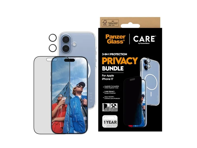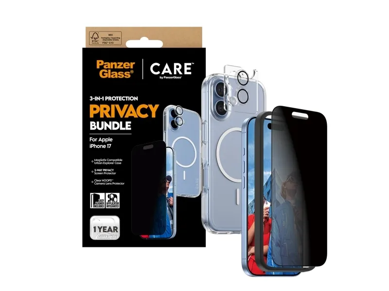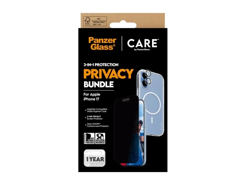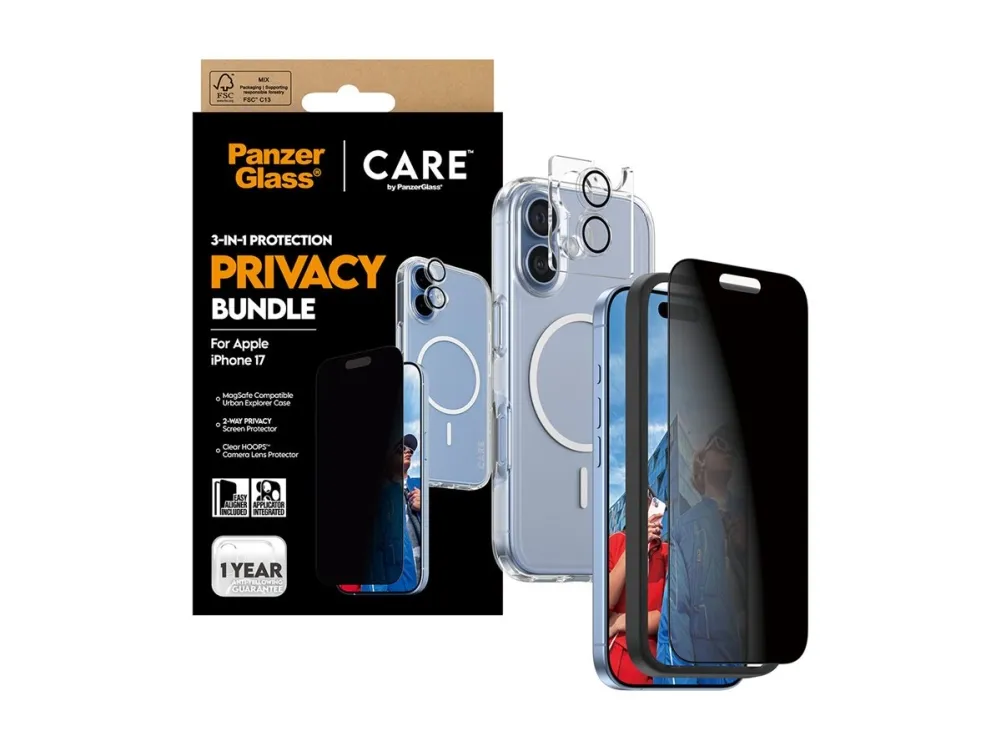 Protect your phone and privacy with the PanzerGlass 3-in-1 Privacy Protection Bundle. Perfect for when you're always on the move, this bundle provides complete protection while ensuring your screen remains private. It includes:PanzerGlass Privacy Screen Protector Ultra-Wide Fit: Made from 60% recycled glass, it protects your screen from scratches and impacts, and comes with a privacy filter to ensure only you can view what's on your screen.PanzerGlass Transparent Hoops Camera Lens Protector: Protects your camera lenses from scratches and damage, ensuring every photo you take comes out sharp and clear.CARE by PanzerGlass Urban Explorer Transparent Case: Our top choice for unbeatable protection. Engineered for city life and adventure, this drop-tested case (up to 4.8 meters) combines toughness with style. Crafted from recycled plastic and comes with a 1-Year Anti-Yellowing guarantee – no hassle, no questions.Installation is also easy. Just mount the screen protector using the enclosed EasyAligner, apply the camera lens protector, and click on the case. To make it even easier, we've included step-by-step instructions as well as a QR code for quick access to our online how-to video. And once everything is installed, you'll never again fear the sight of your phone tumbling to the ground. This may not happen, but if it does, you'll regret not having clicked "add to cart".