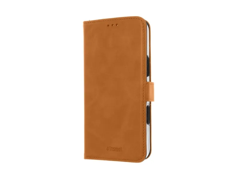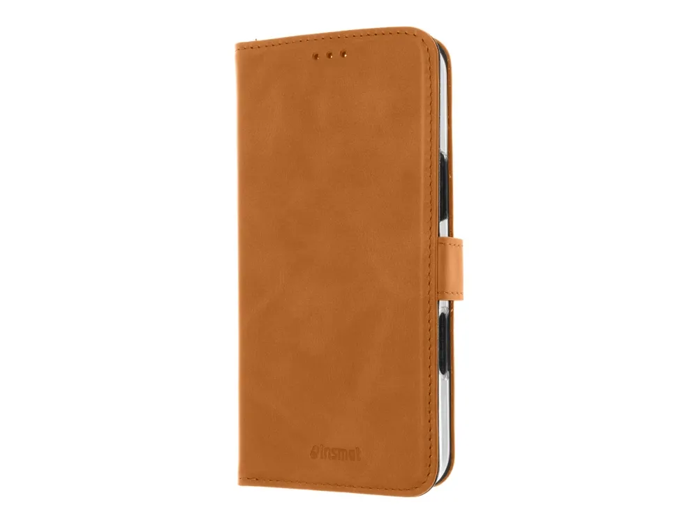 The Insmat Premium protective cover is crafted for cell phones, combining style and functionality. Made with genuine leather and reinforced with thermoplastic polyurethane (TPU), this flip cover offers protection while maintaining an elegant appearance. It includes additional compartments for up to 3 credit cards, ensuring that essentials are always close at hand. The magnetic closure secures your device, while the RFID blocking feature provides peace of mind against electronic theft.