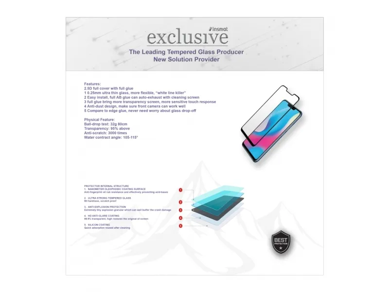 The Insmat Exclusive screen protector provides durable protection for cellular phones with its 3D edge design that ensures a full-screen fit. Made from 9H tempered glass, it offers various protective features including scratch resistance, dust resistance, and smudge-proof technology. The oleophobic coating resists fingerprints, making it easier to maintain a clean display. Included in the package are a wet cleaning wipe, a dust removal sticker, and a dry cloth for straightforward installation and upkeep.