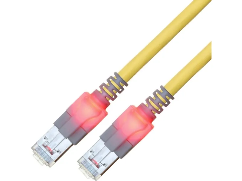 EasyLan Dualboot LED patchkabel RJ45 S/FTP Cat.6 (klasse E), med saCon-stik, LSOH, gul, 10 m. Tilslutningskabel RJ45/RJ45 skærmet Cat.6, 500 MHz, halogenfri, 1:1 belægning Med lysgenkendelse af saCon-stikket Til brug på kontoret, industri og datacentre Særligt robust kabelopbygning