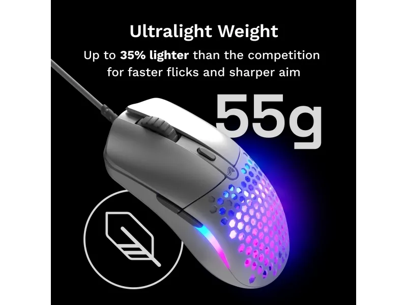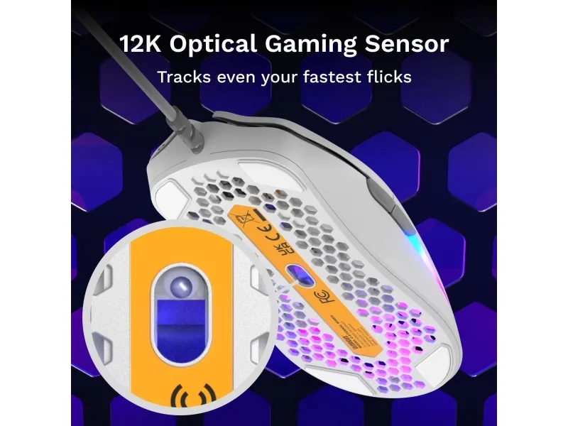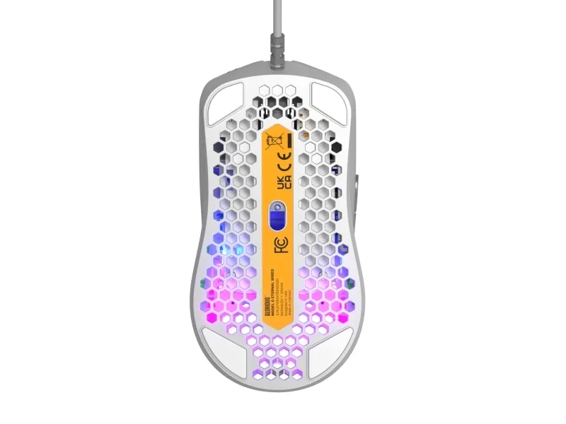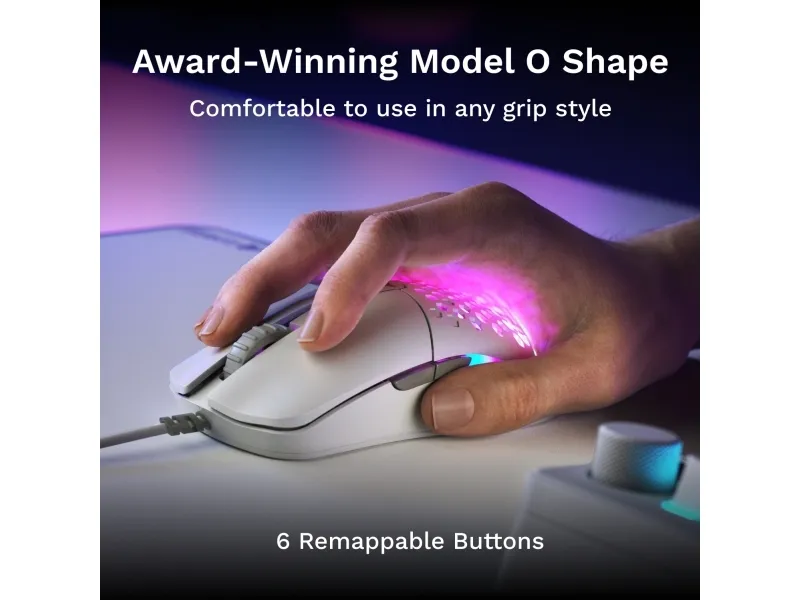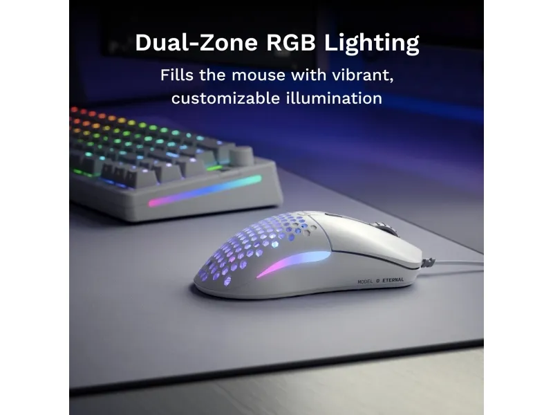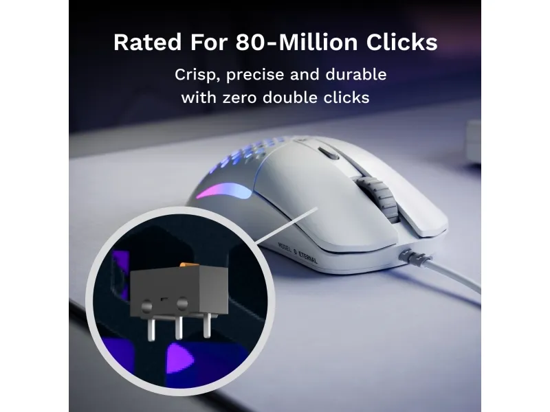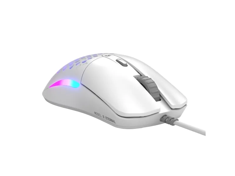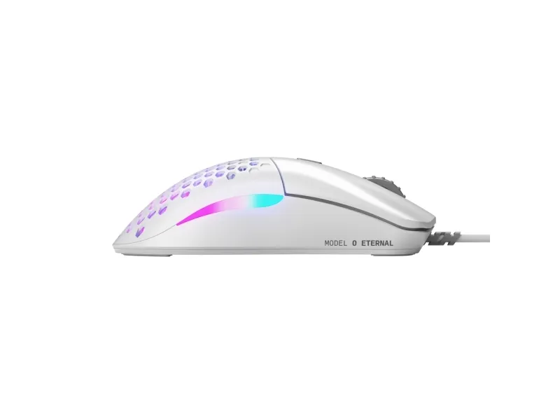 The Model O Eternal ultralight RGB gaming mouse delivers award-winning shape, speed, and precision in a sleek new 55g design. With 6 remappable buttons, vibrant RGB side panels, and an 80M-click lifespan, it’s built to stack wins. A 12K DPI sensor ensures flawless tracking—so if you miss, it’s on you. Glorious Gaming Model O Eternal. Form factor: Right-hand. Movement detection technology: Optical, Device interface: USB Type-A, Movement resolution: 12000 DPI, Buttons type: Pressed buttons, Buttons quantity: 6, Scroll type: Wheel. Illumination colour: Multi. Power source: Cable. Product colour: White