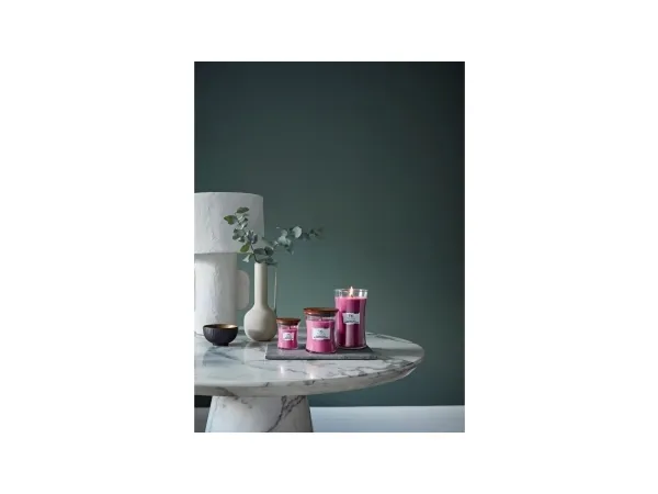 WoodWick® duftlys med den patenterede karakteristiske trævæge, sofistikerede dufte og eksklusive, stilrene design skaber øjeblikke af luksus og forkæler sanserne med bløde lyde af en knitrende ild. WoodWick® duftlys har et rent, moderne design med raffineret stil og elegante former. Hvert WoodWick® lys har komplekse, sofistikerede dufte, som er nøje udvalgt og testet. Alle lys leveres med et flot trælåg og smukke etiketter. Produceret af en eksklusiv blanding af soja og paraffinvoks. Wild Berry & Beets: Aromaer af vilde bær og fyldige rødbeder tilsat dufte af eg, appelsin og orris. Topnote: Mynte, vilde jordbær, vilde hindbær Mellemnote: Rødbeder, appelsin, vintergrønt Bundnote: Patchouli, eg, orris Brændetid: Large 180 timer. Vægt: 610g. Vægt inkl. glas: 1.120g.