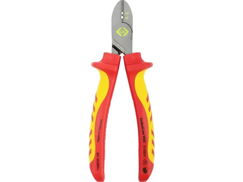Redline VDE-skævbider med afisoleringsgule, 160 mm Afisoleringsben for problemfri og ikke-ødelæggende afisolering af 1,5og 2,5-mm²-tråd Forbedret grebsdesign med 30 % mere materiale Afrundet design, der giver mindre træthed og længere greb giver en større vægtstangsvirkning Ergonomisk tokomponent-design med skridsikre greb for mere komfort, kontrol og sikkerhed Nye REDLINE-VDE-greb med øskner til fastgørelse af en faldsikring Til byggeri, vedvarende energi og industri Sikkert arbejde i højden i henhold til ANSI-standard VDE-testet Individuelt testet op til 10.000 V for et sikkert arbejde under spænding op til 1.000 V. Induktionshærdede kæber for fremragende langtidseffekt Skærestempel med optimeret C.K-geometri Sænksmedet specialstål OPFYLDER IEC 60900:2004; VDE0682/201; ISO 5749